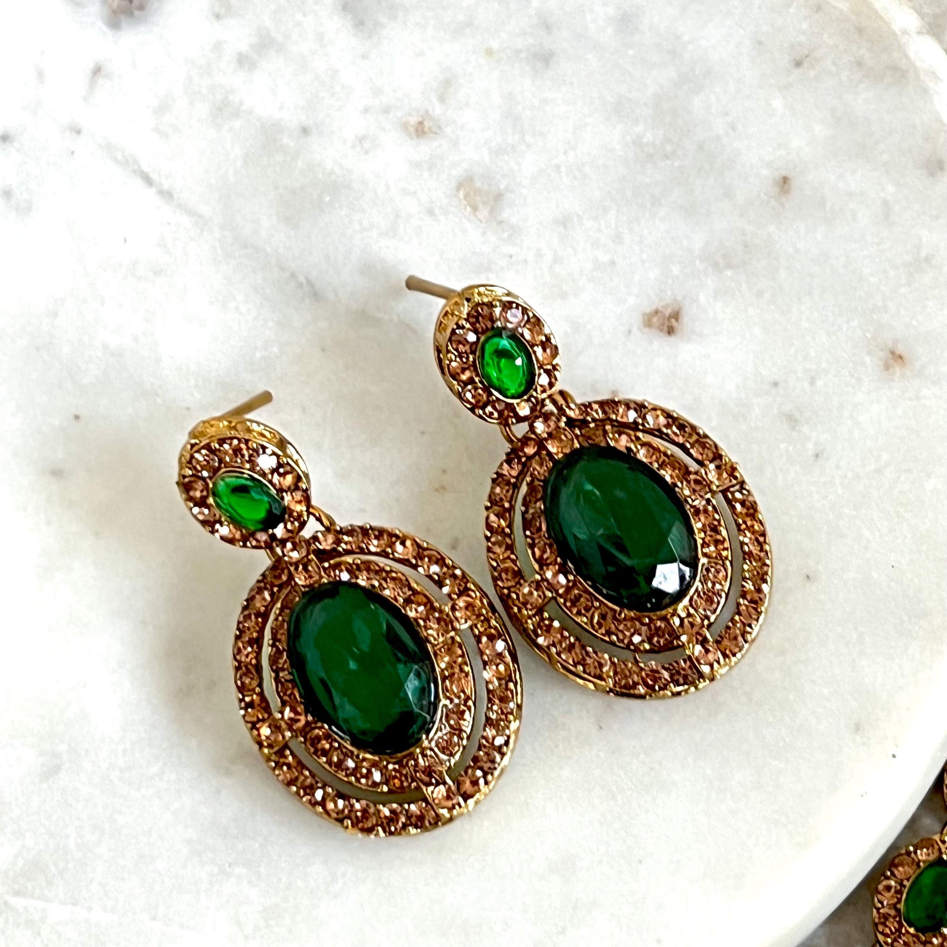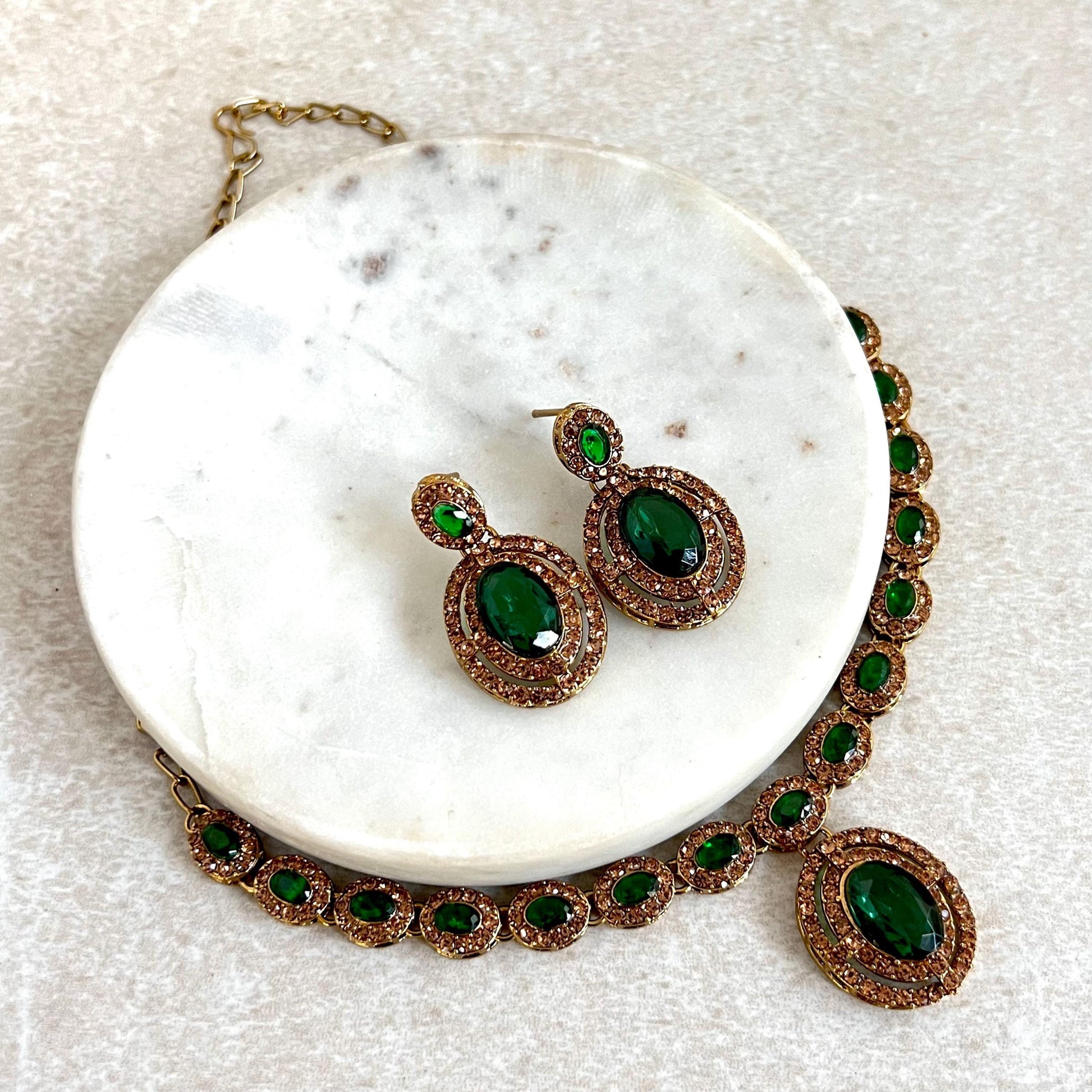 Green Antique Gold Small Simple Necklace Earring Set High Quality Indian Pakistani Bollywood Fashion Jewellery Lightweight Sale