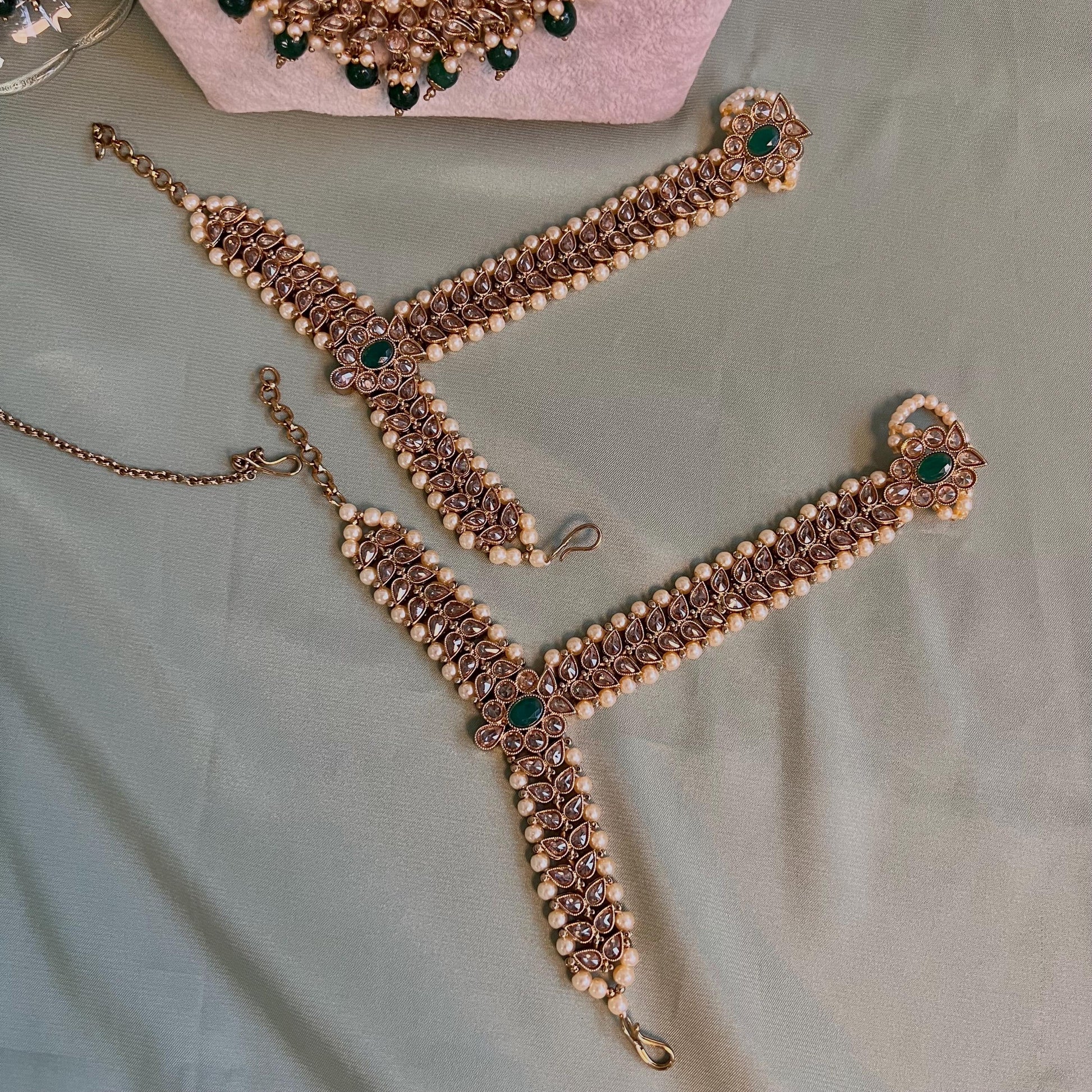 This gorgeous full green bridal set with champagne stonework includes following matching pieces.