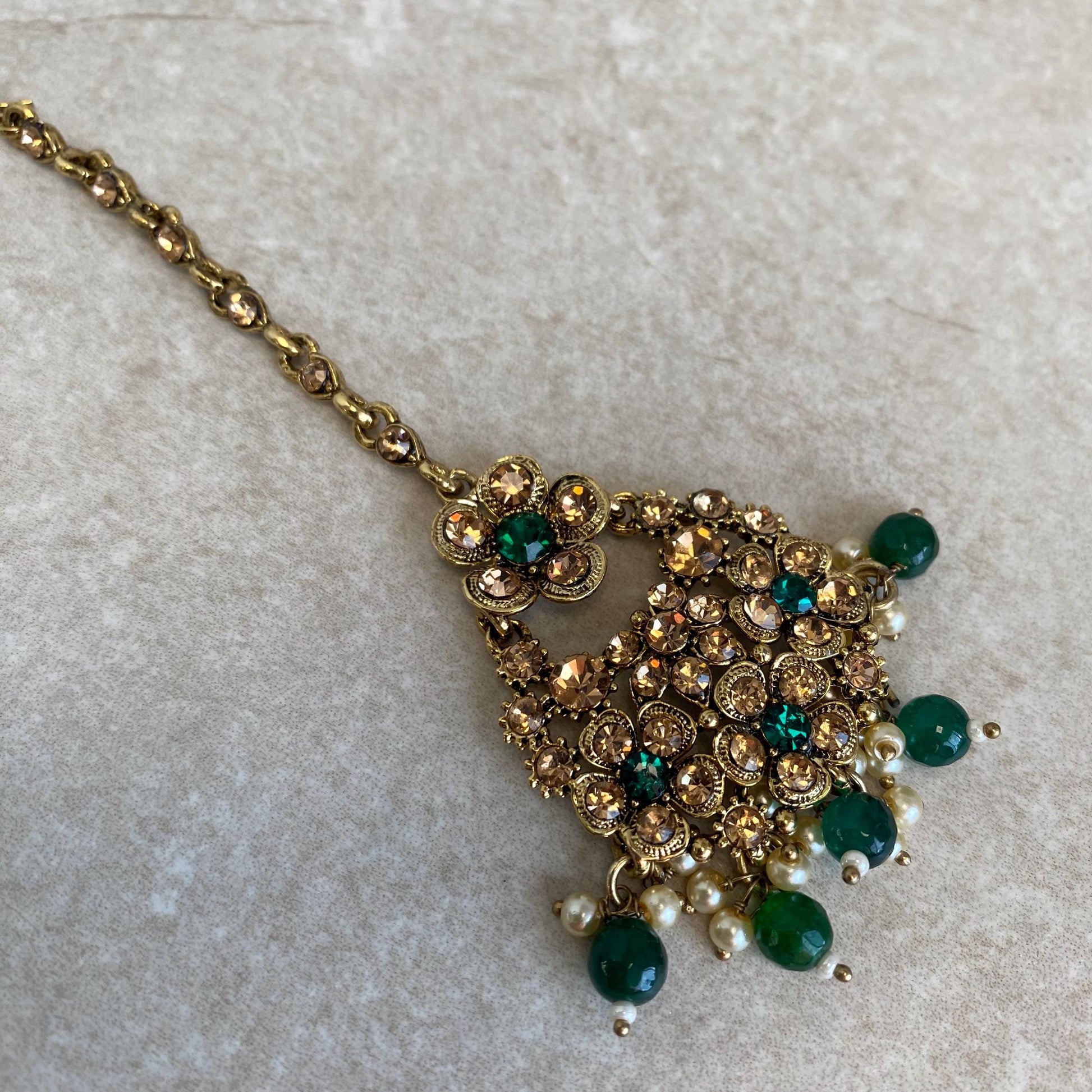 Green Large Antique Gold Golden Rhinestone Jhumka Earring Indian Pakistani Bollywood Fashion Jewellery High Quality Gift for Her Add Tikka