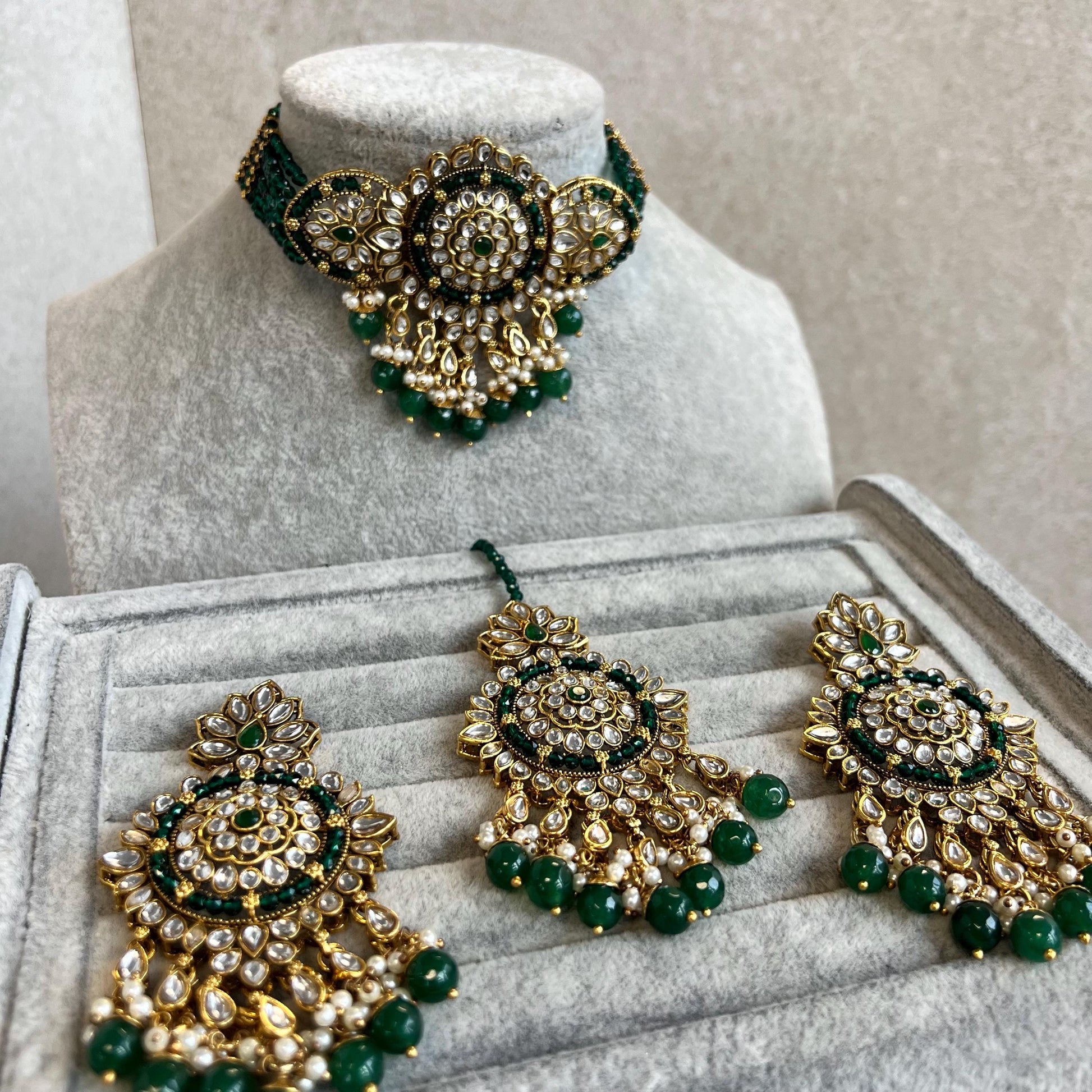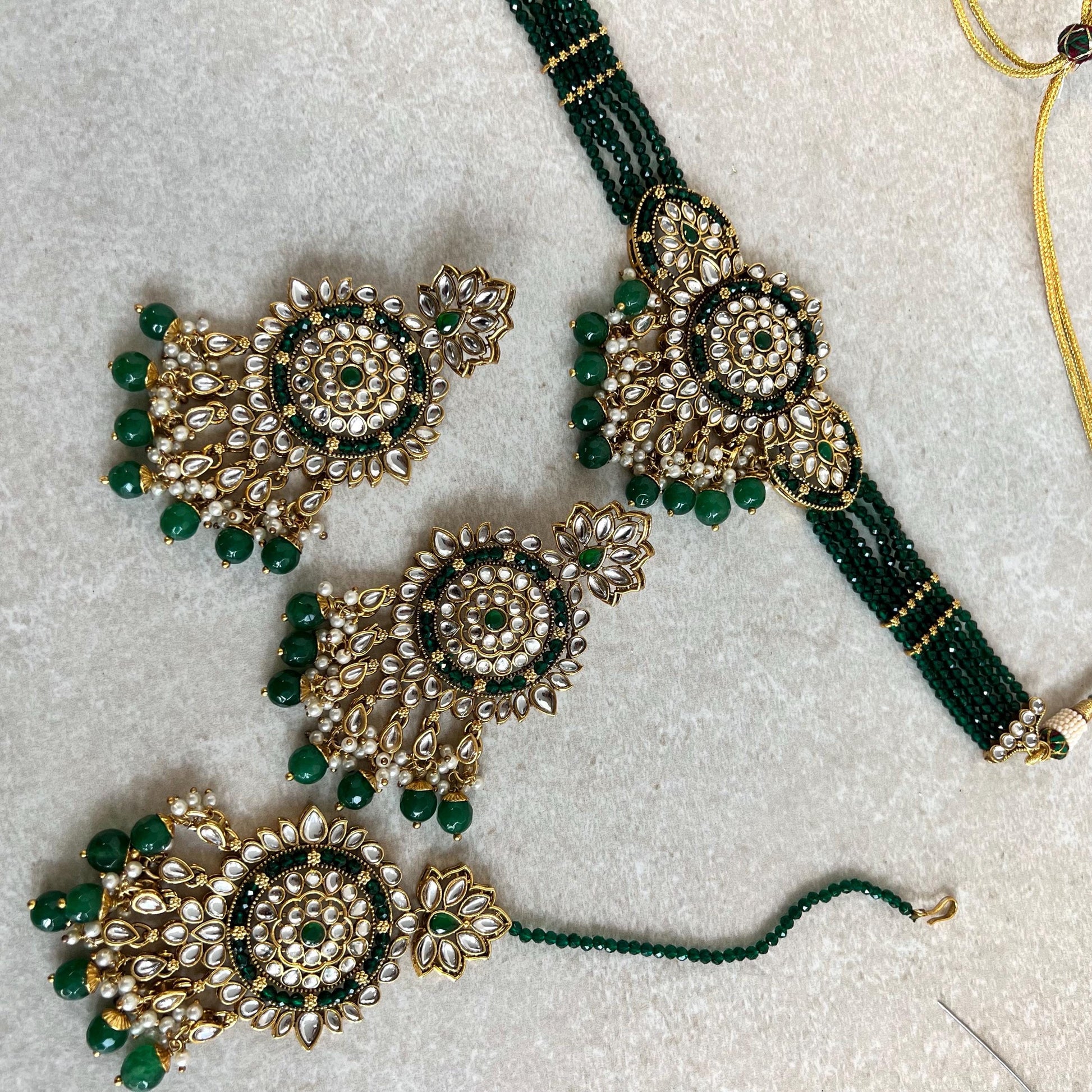 Green Large Faux Kundan Choker Set Earring/ Tikka High Quality Bright Gold Emerald Green Indian Pakistani Bollywood Fashion Jewellery Gift
