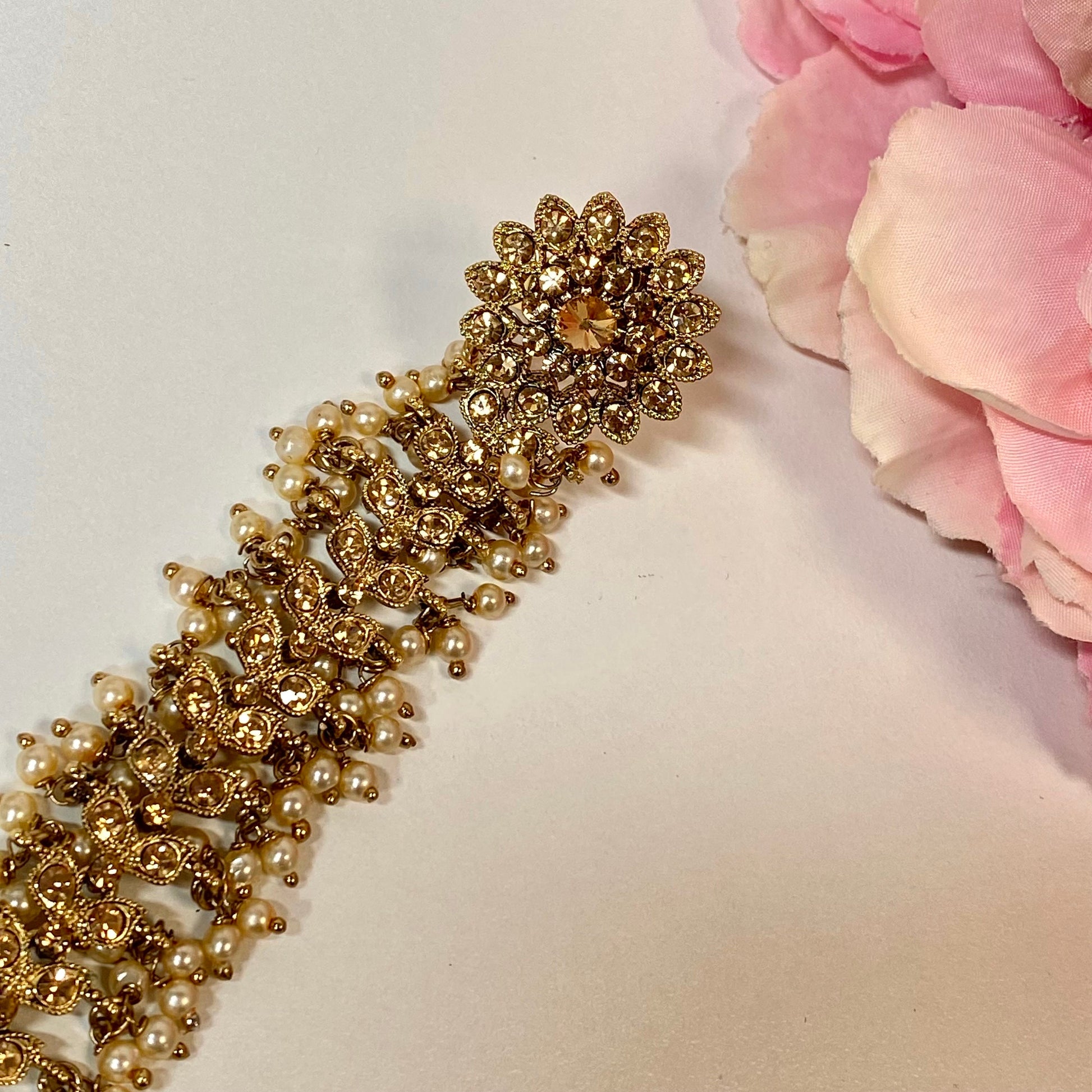 Stunning antique gold base with golden rhinestones hand harnes