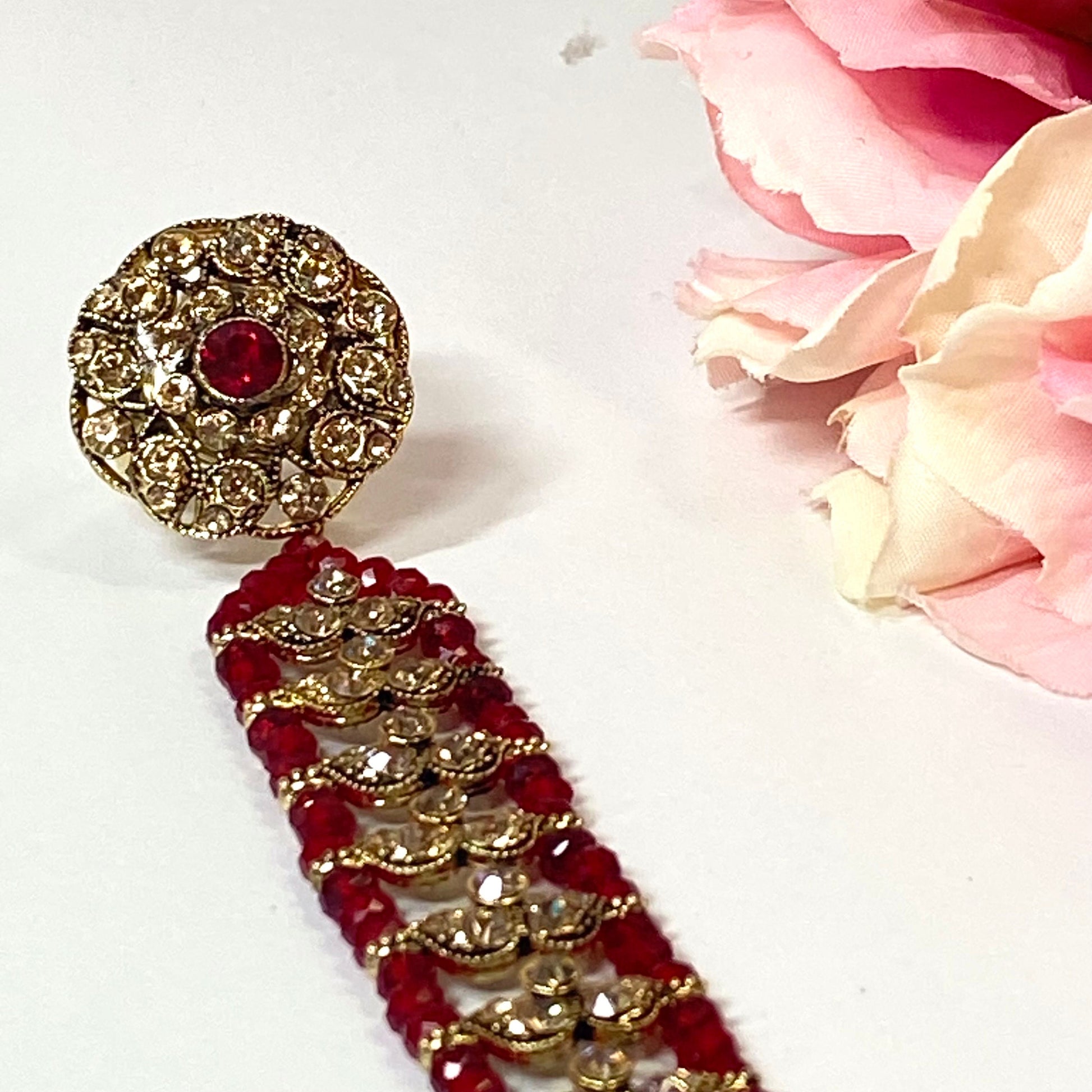 Stunning antique gold with golden rhinestones and maroon bead hand harnes