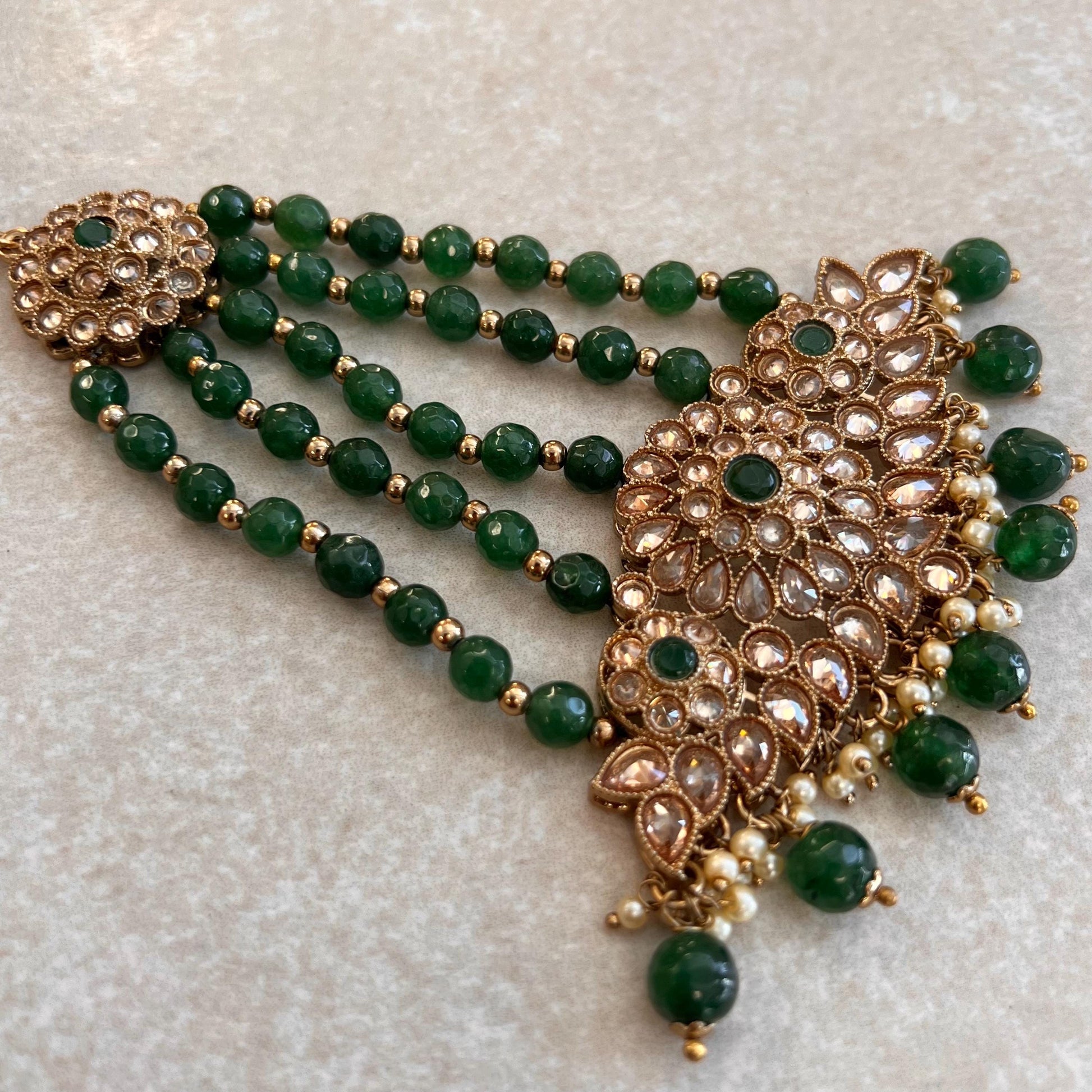 Jhumar/Green/Gold/Emerald Green Bead/Champagne Zircon Crystal/ Jhoomar / Passa/ Indian/ Pakistani Style/Head Piece High Quality