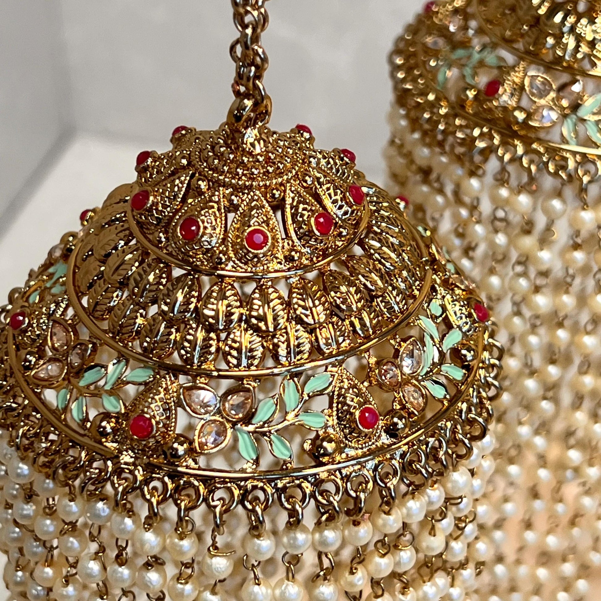 Kaleera (Pair) Extra Large Mint Ruby Pink Luxury Antique Gold with Champagne Zircon Crystals. High Quality Adjustable one size fits all