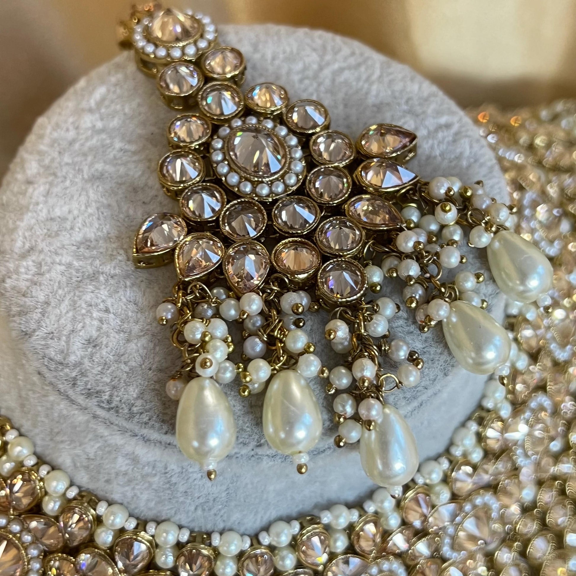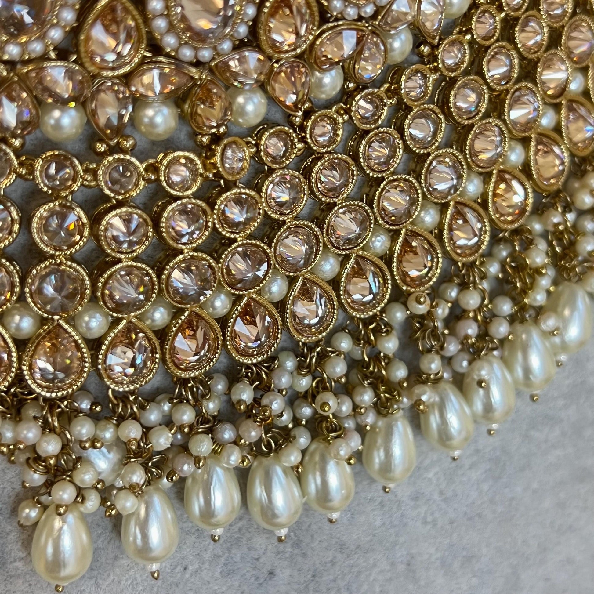Large sparkling bridal antique gold necklace set with beautiful champagne zircon crystal, sold as a set with large jhumka earring and tikka!