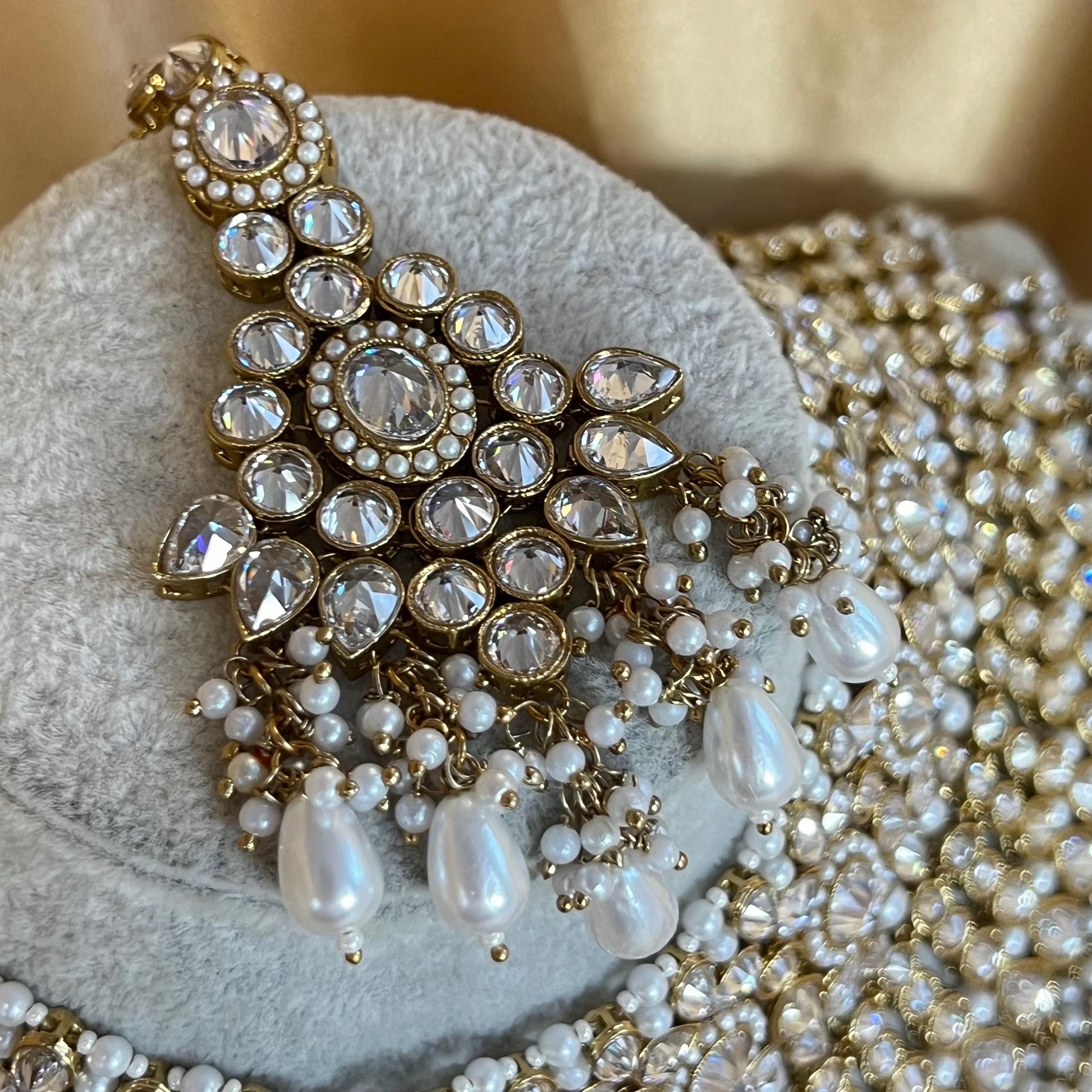 Large sparkling bridal antique gold necklace set with beautiful clear zircon crystal, sold as a set with large jhumka earring and tikka!