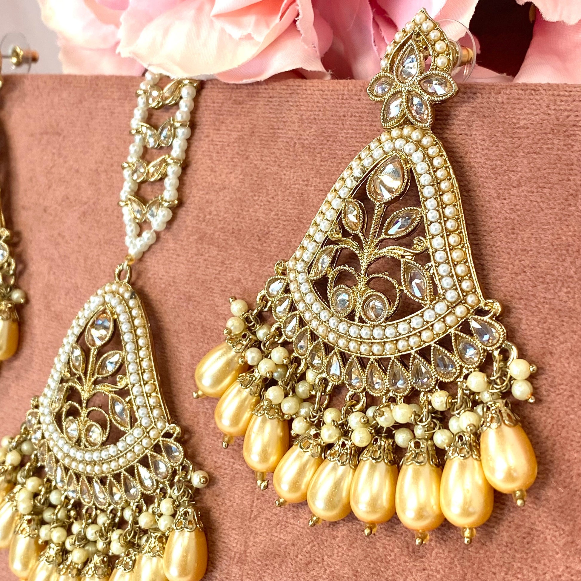 Large Earring and Tikka Set- Champagne Pearl/Flat Earring Indian/ Pakistani Style