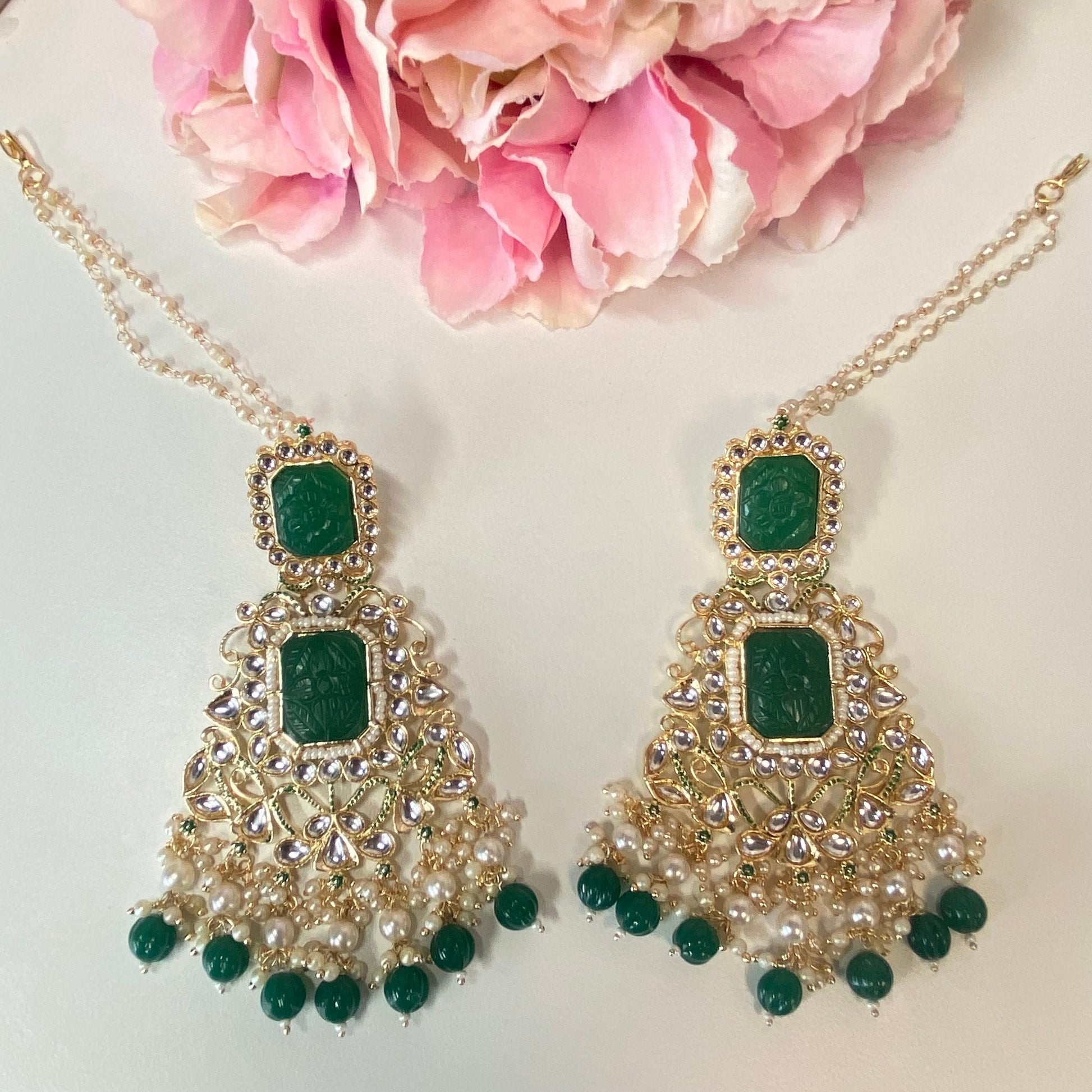 This gorgeous extra large faux Kundan earrings has ear chains (not detachable)