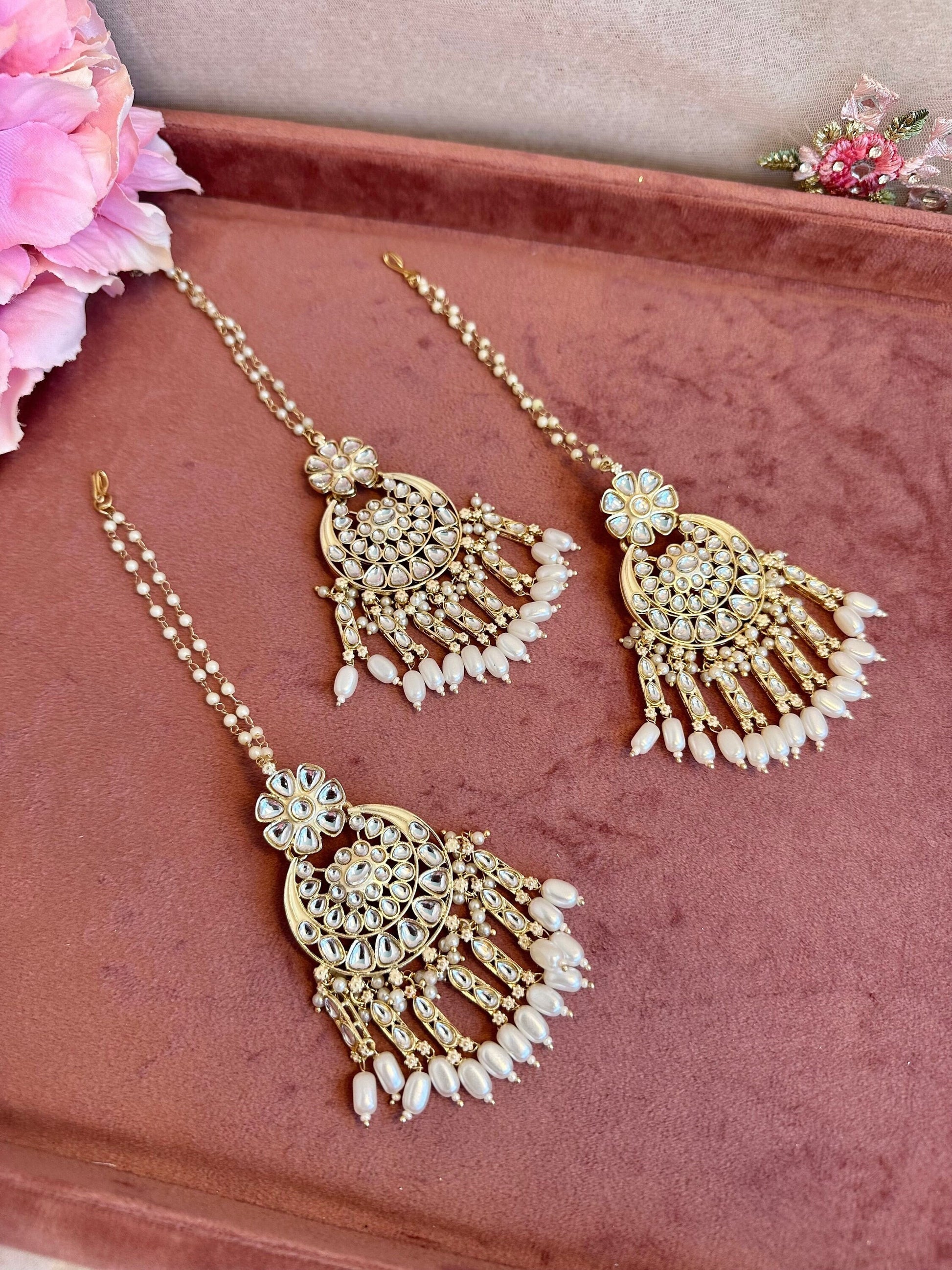 This faux kudan earrings and tikka set comes with attached ear chains and matching tikka.
