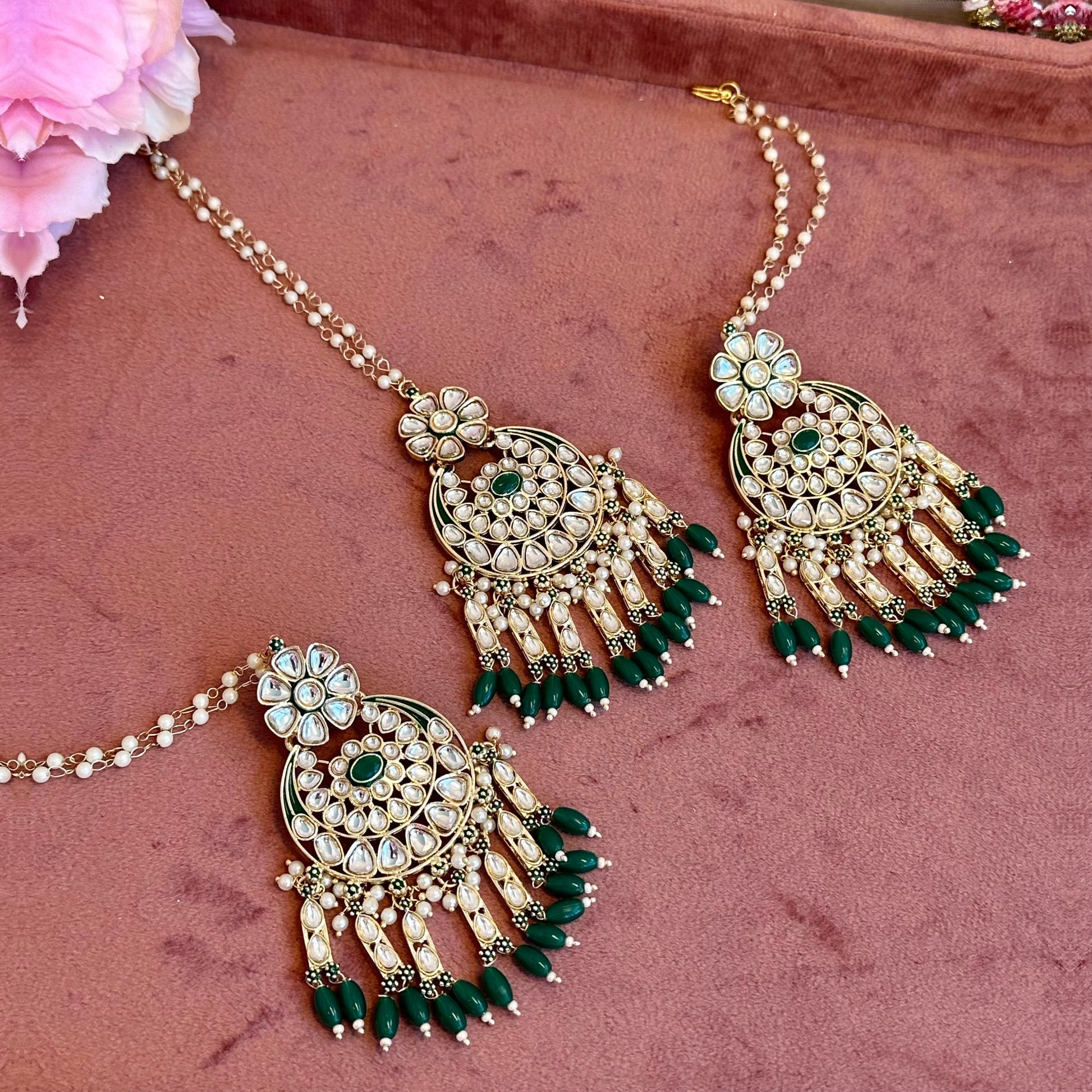 Large Faux Kundan Earrings & Tikka Set - Green/Meenakari/ Indian/ Pakistani Style/