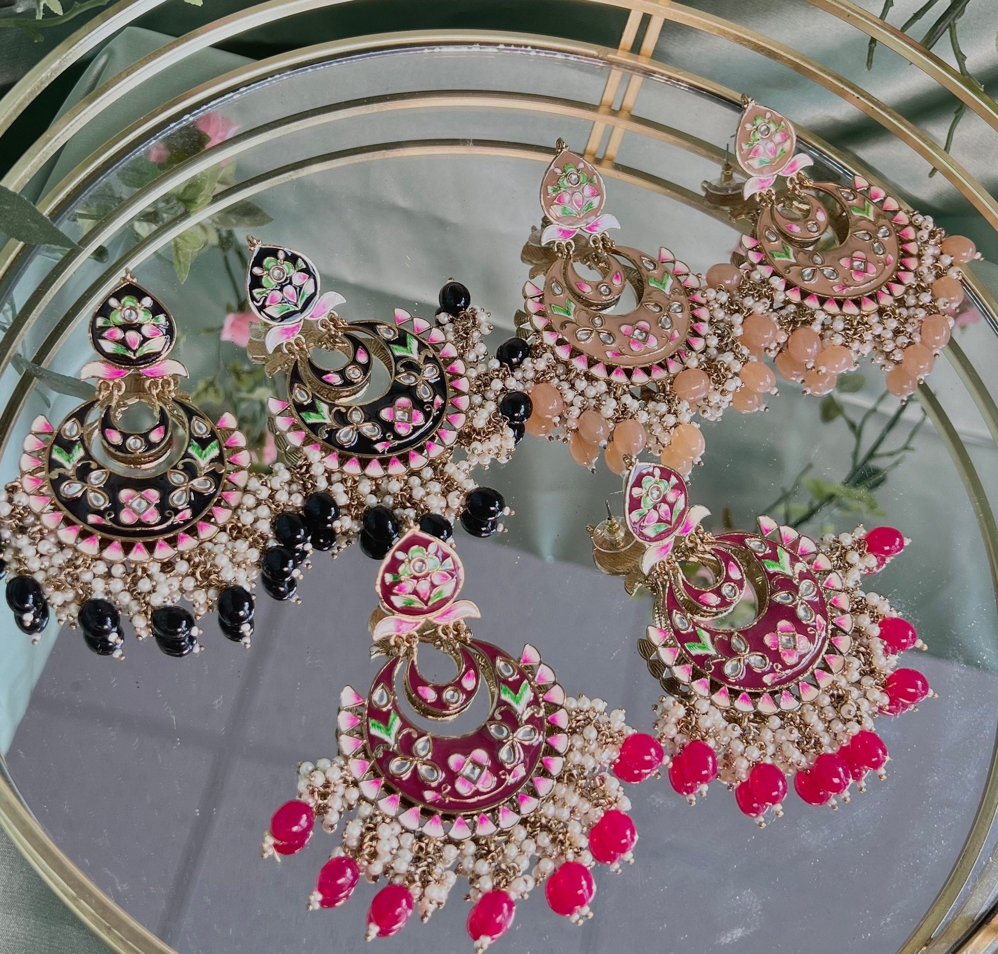 Large, Hand painted earrings and chain detail with tiny pearls and faux kundan details.