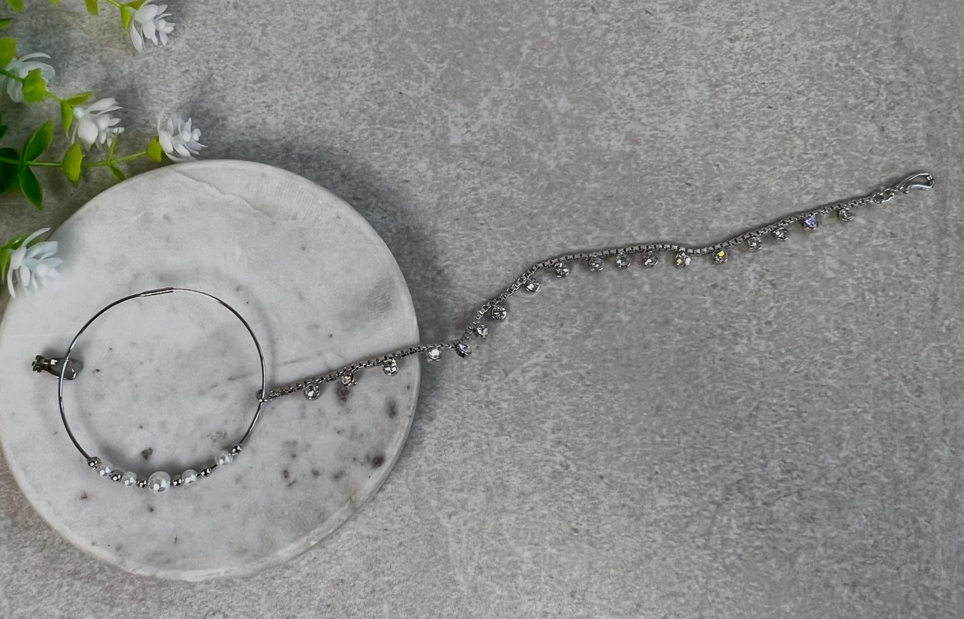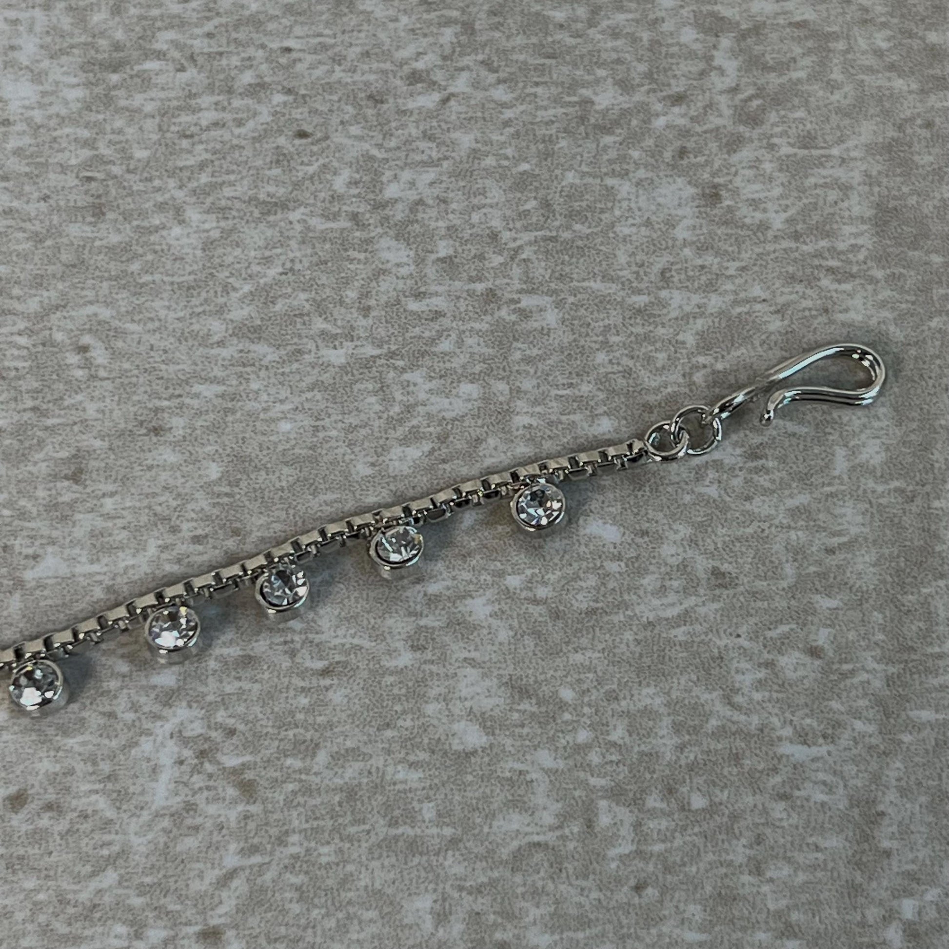 Silver nose ring with clear crystal stone work on chain and white beading.