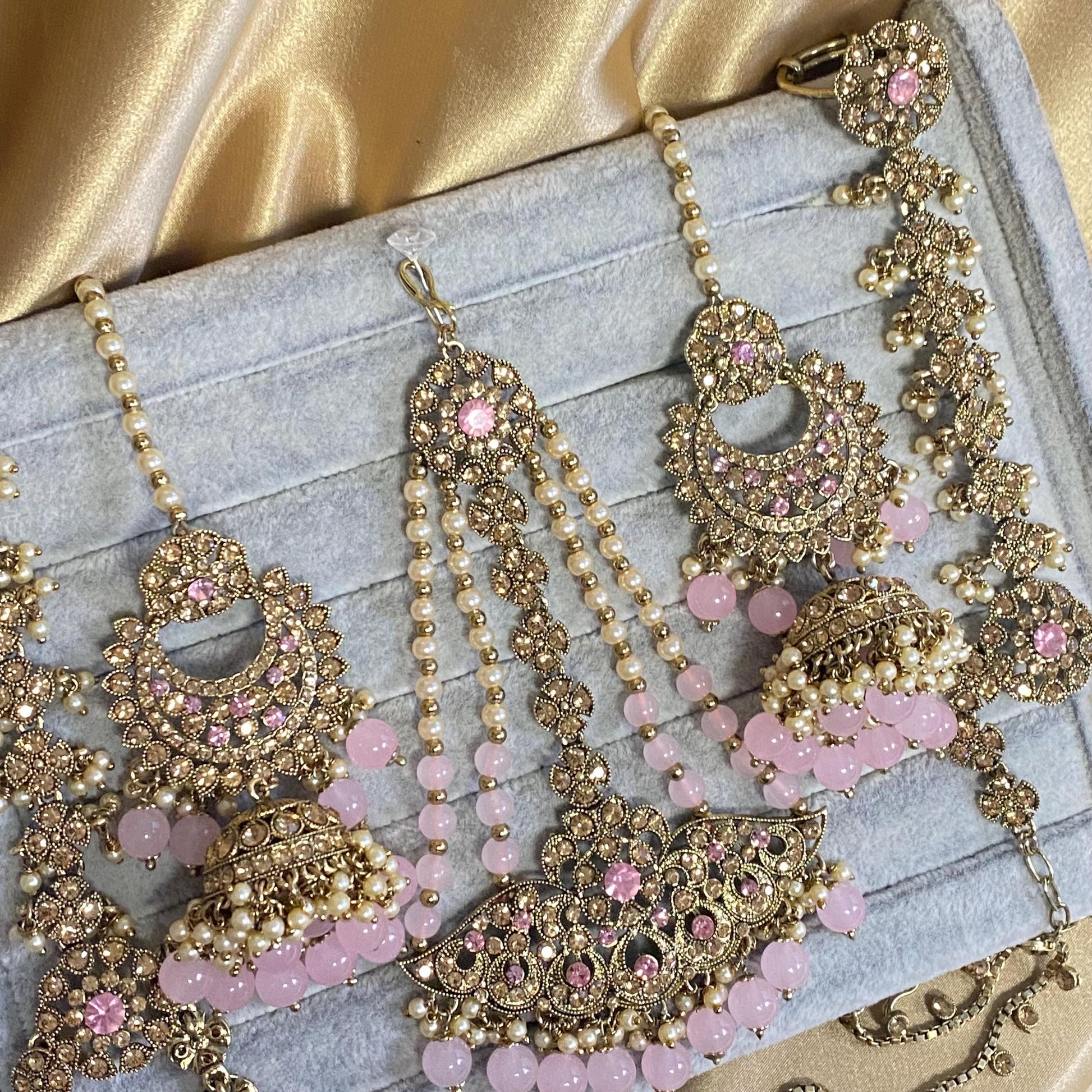 Light Pink Golden Full 8 Piece Bridal Necklace Set Traditional Indian Pakistani Style Wedding Fashion Jewellery Heavy Necklace set Sale