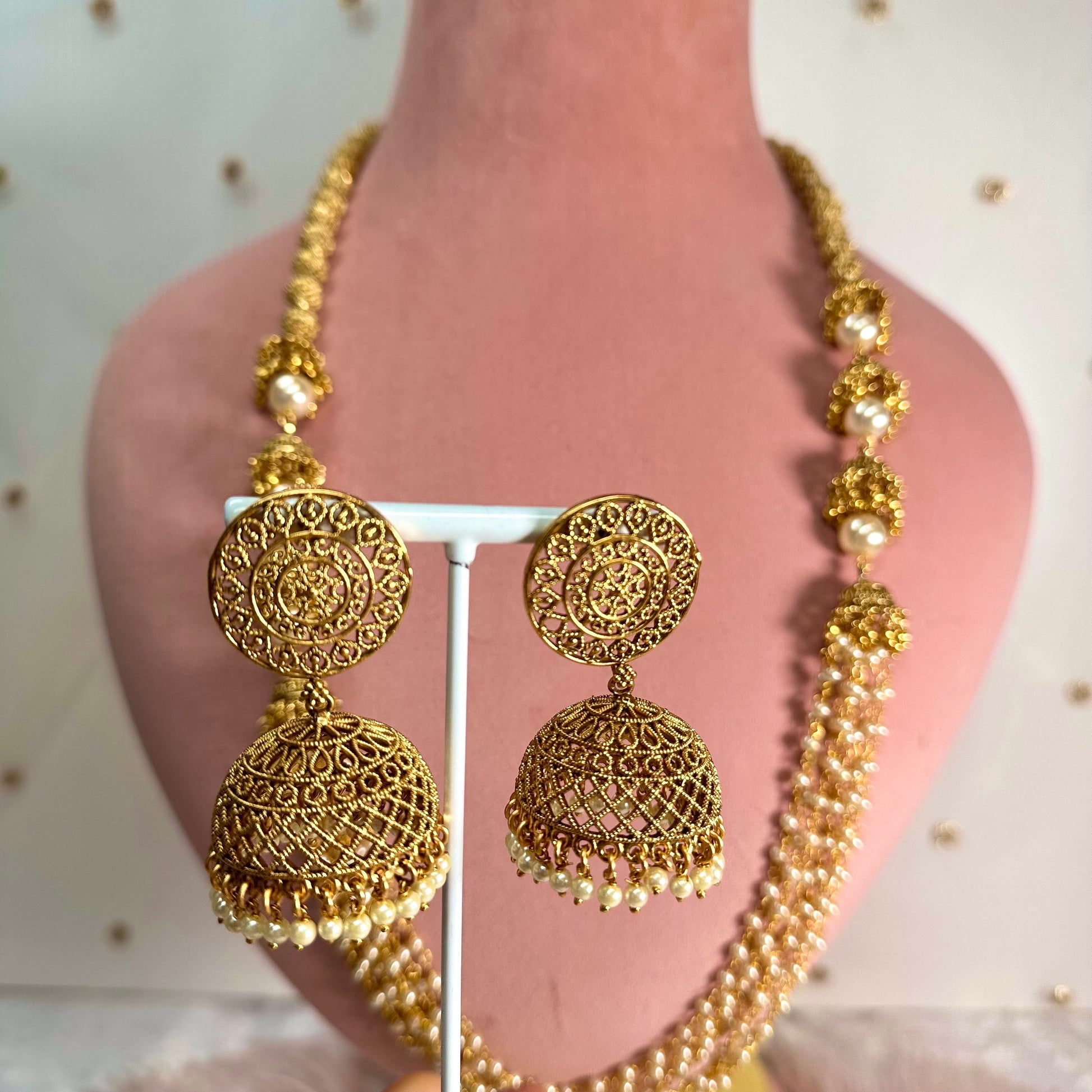This stunning vintage gold long necklace is sold as a single piece In a bright gold shade with pearl details.