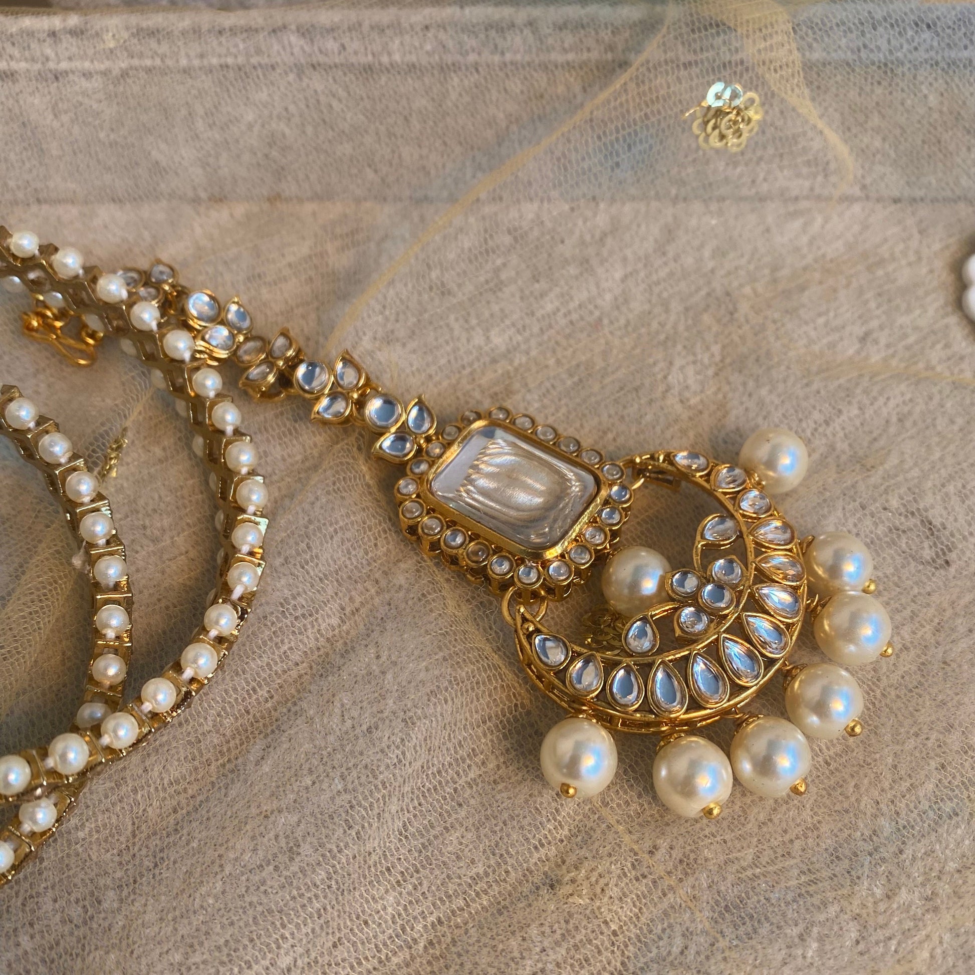 This gorgeous 2 strand single long necklace set faux Kundan set includes matching Jhumka earring and tikka