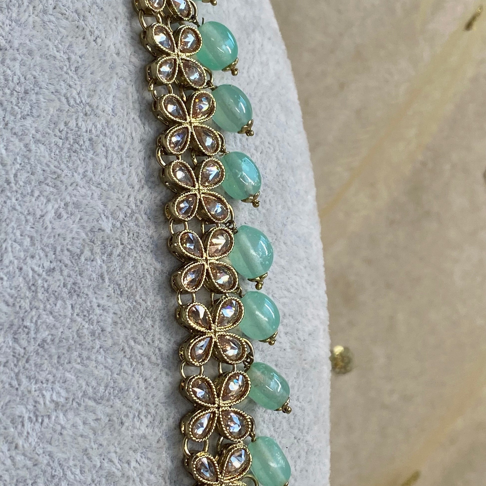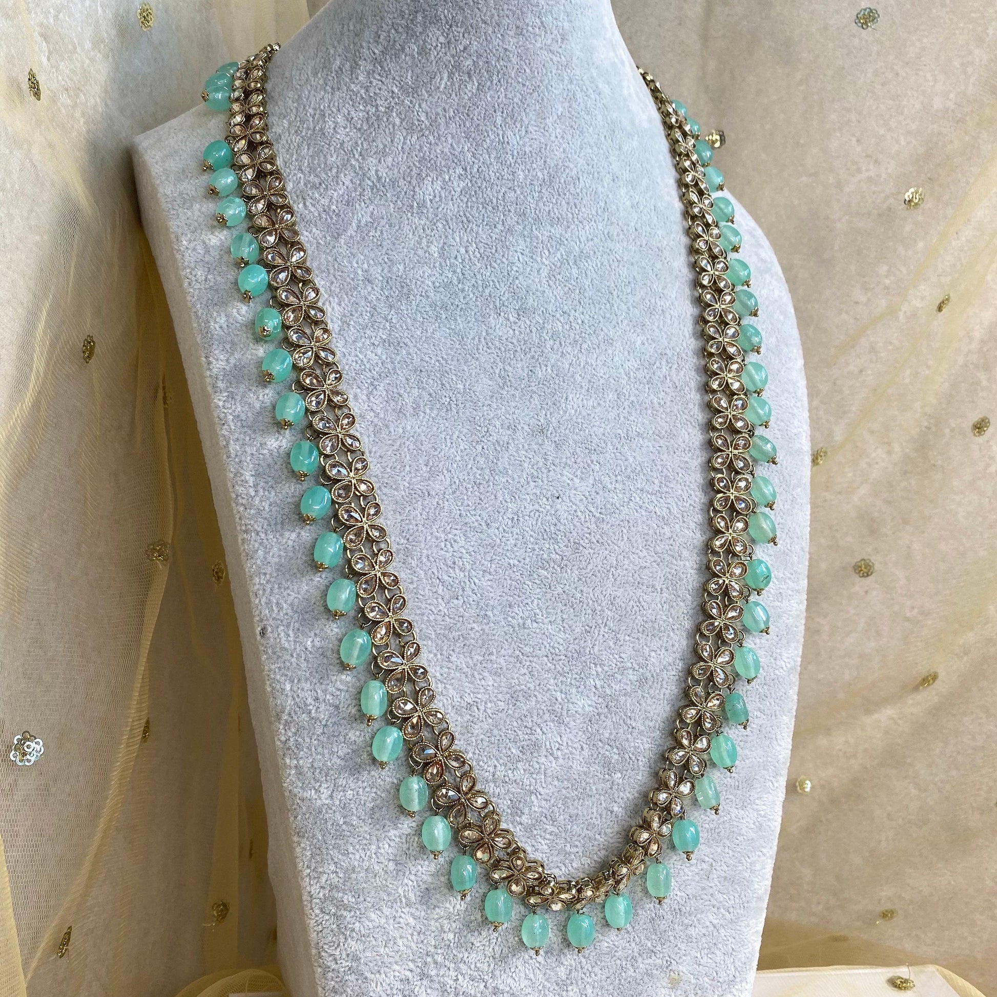 This gorgeous long necklace set is made with antique gold base and beautiful champagne zircon crystals with mint beads.