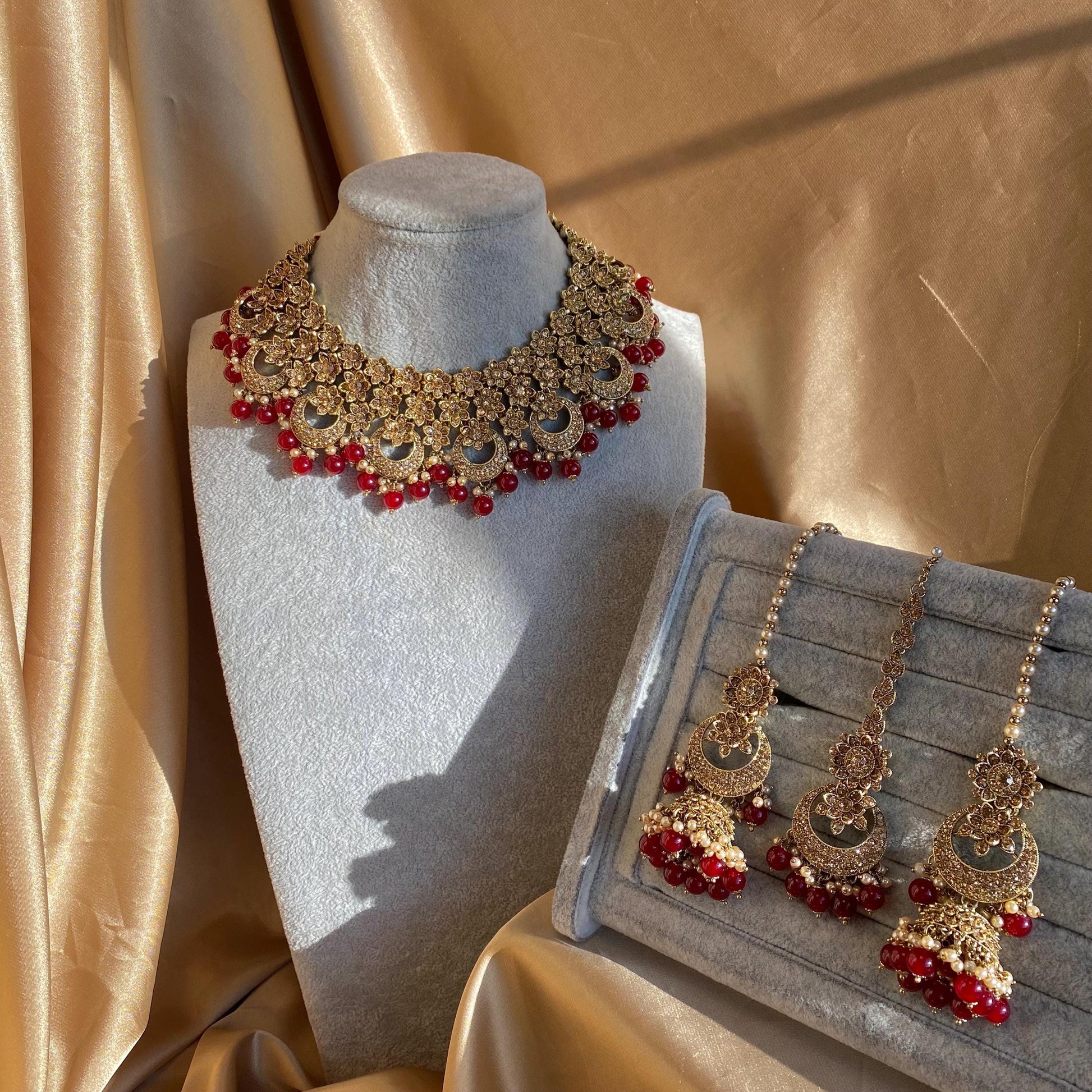 Maroon Antique Gold Rhinestone Bridal Necklace Set Jhumka Chain Earring Tikka Bollywood Indian Pakistani Fashion Jewellery High Quality SALE