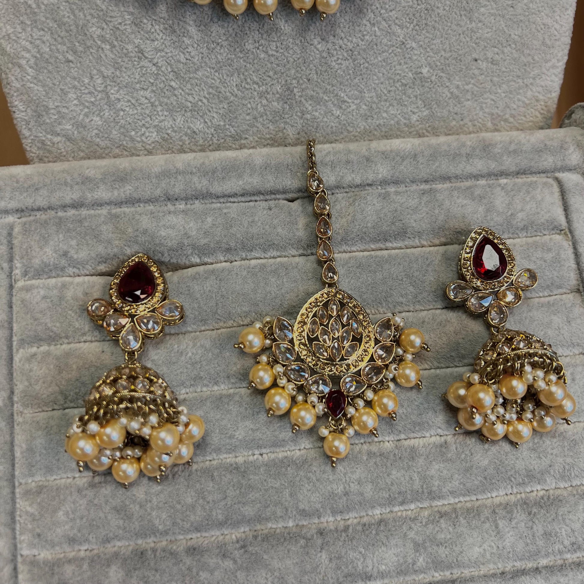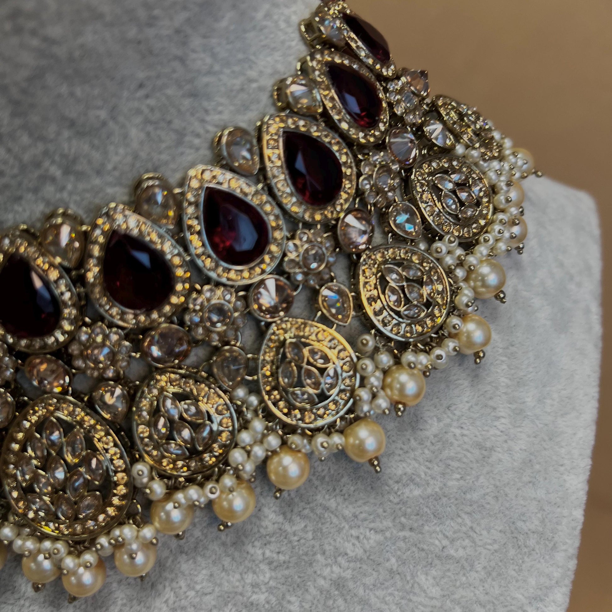 Maroon Bridal Choker Necklace set with Earring, Tikka and Jhumar Indian/ Pakistani Style/ Wedding/ Antique Gold/ Champagne Crystals