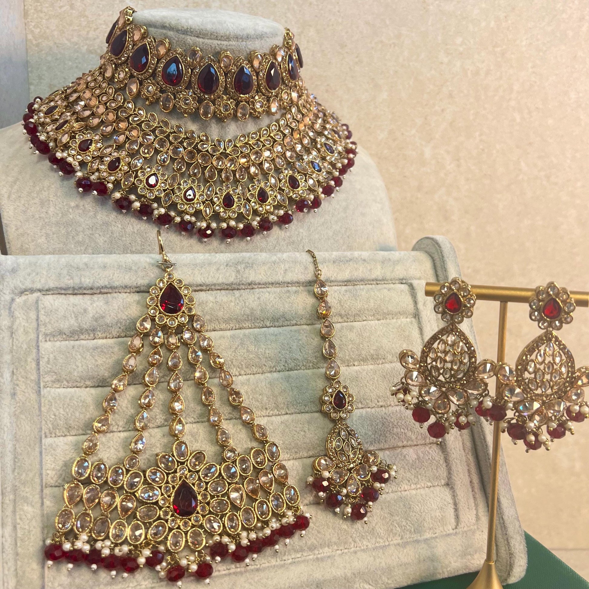 Maroon Bridal Choker Necklace set with Earring, Tikka and Jhumar Indian/ Pakistani Style/ Wedding/ Antique Gold/ Champagne Crystals