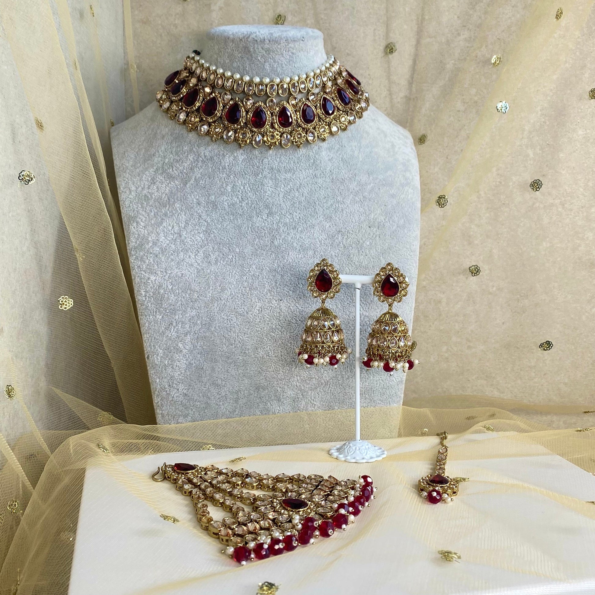 Beautiful antique gold choker set with dazzling champagne zircon crystals and maroon stones. Plus maroon glass beads. Perfect bridal set