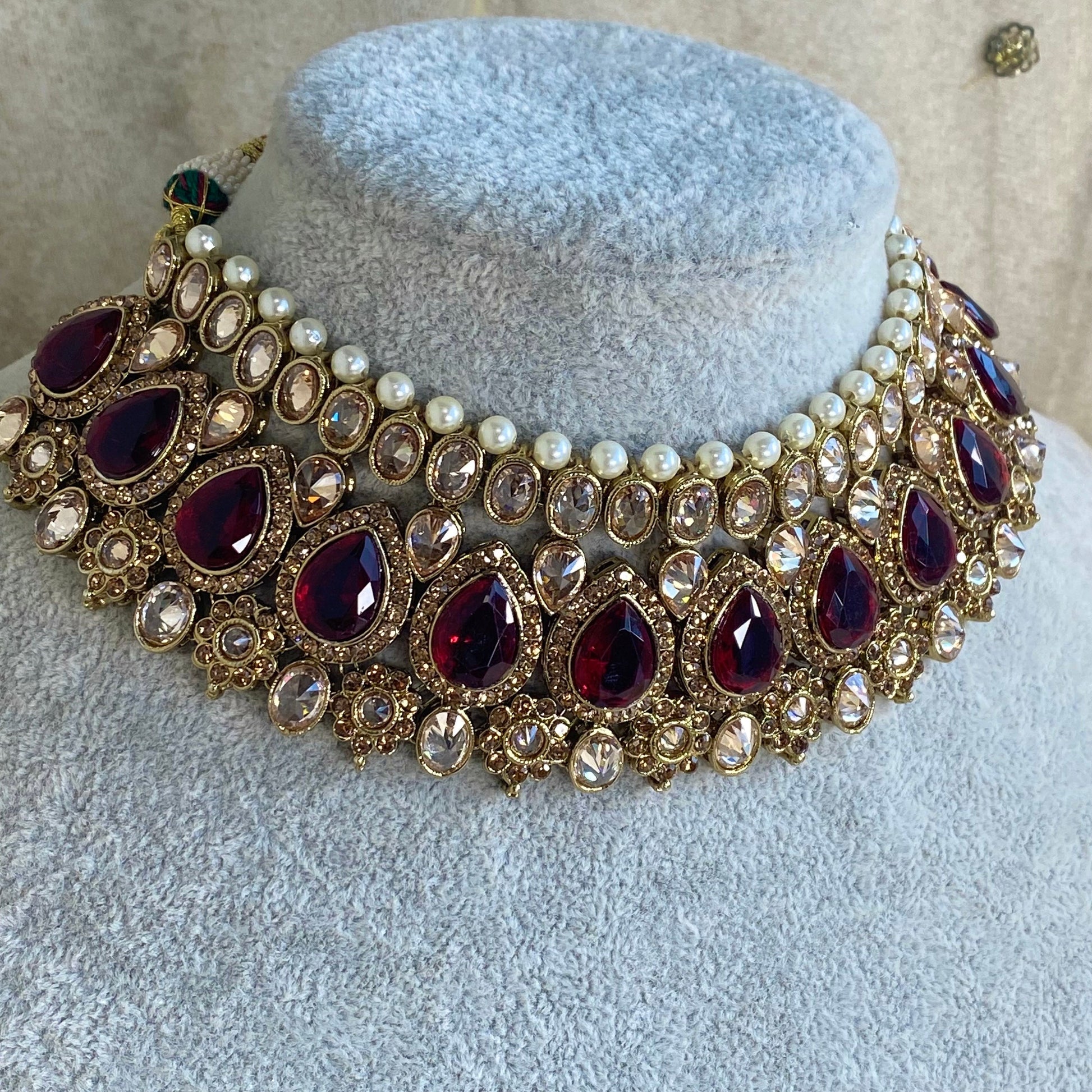 Beautiful antique gold choker set with dazzling champagne zircon crystals and maroon stones. Plus maroon glass beads. Perfect bridal set