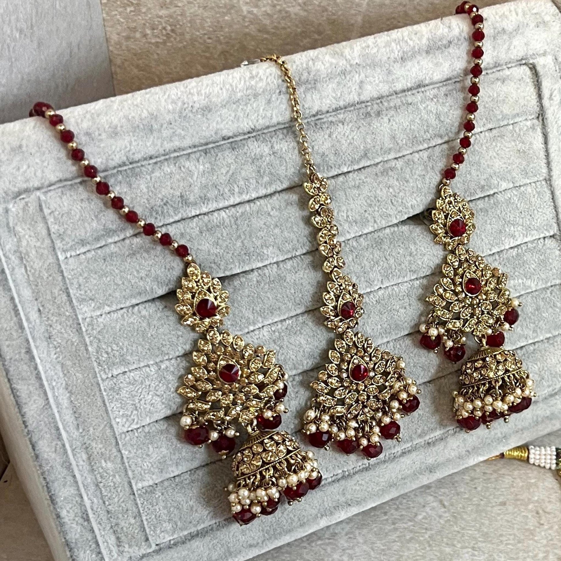 long jhumka earrings with attached maroon chains (approx 3 inch length x 1.5 width), and matching tikka (pendant part 2 inch length x 1 inch width)