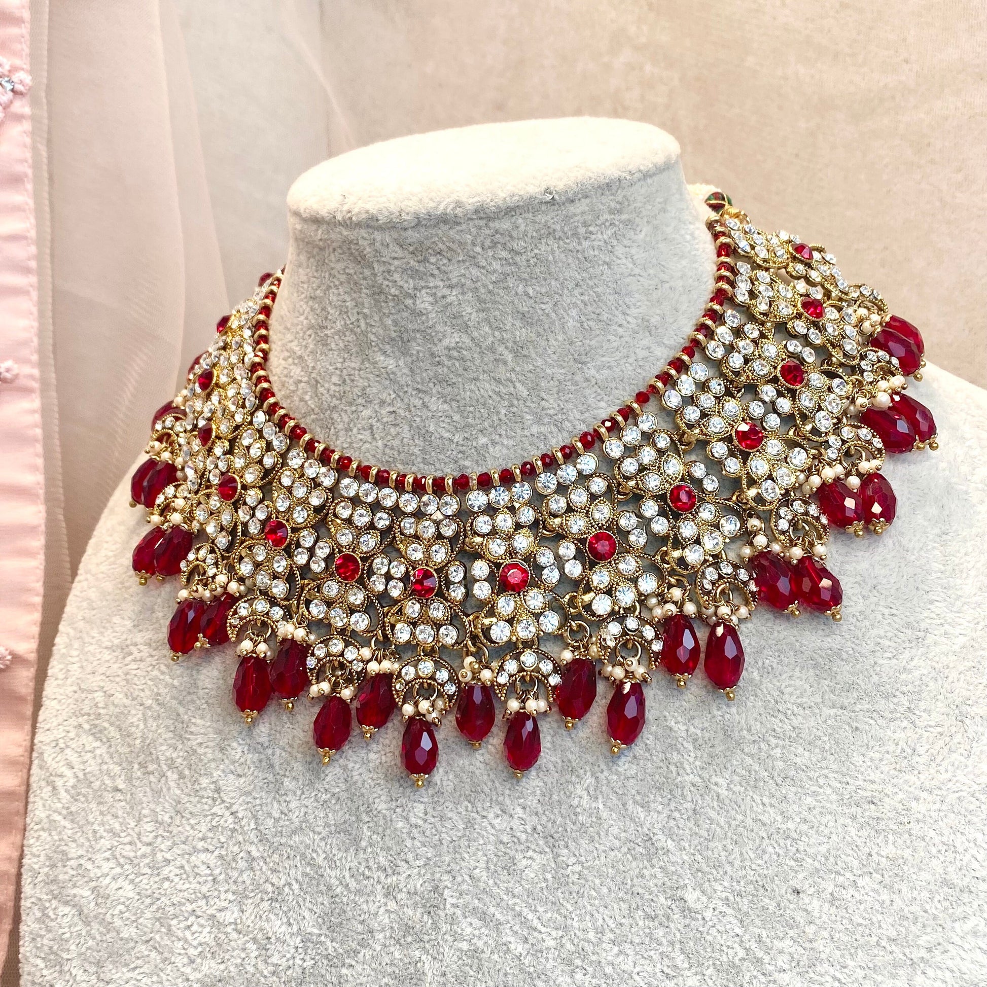 Beautiful antique gold necklace set with dazzling silver crystal rhinestones, maroon stones and maroon beads