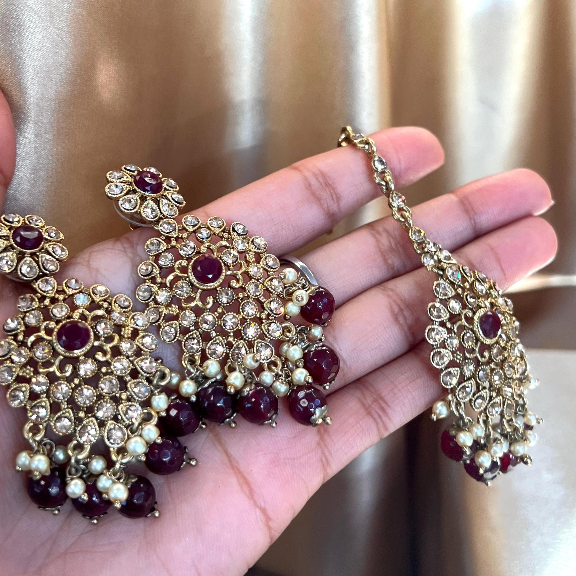 Maroon Earring and Tikka only/ Flat Earring Indian/ Pakistani Style/ Gift/ High Quality Lightweight Jewellery/ Desi Fashion/ Sale