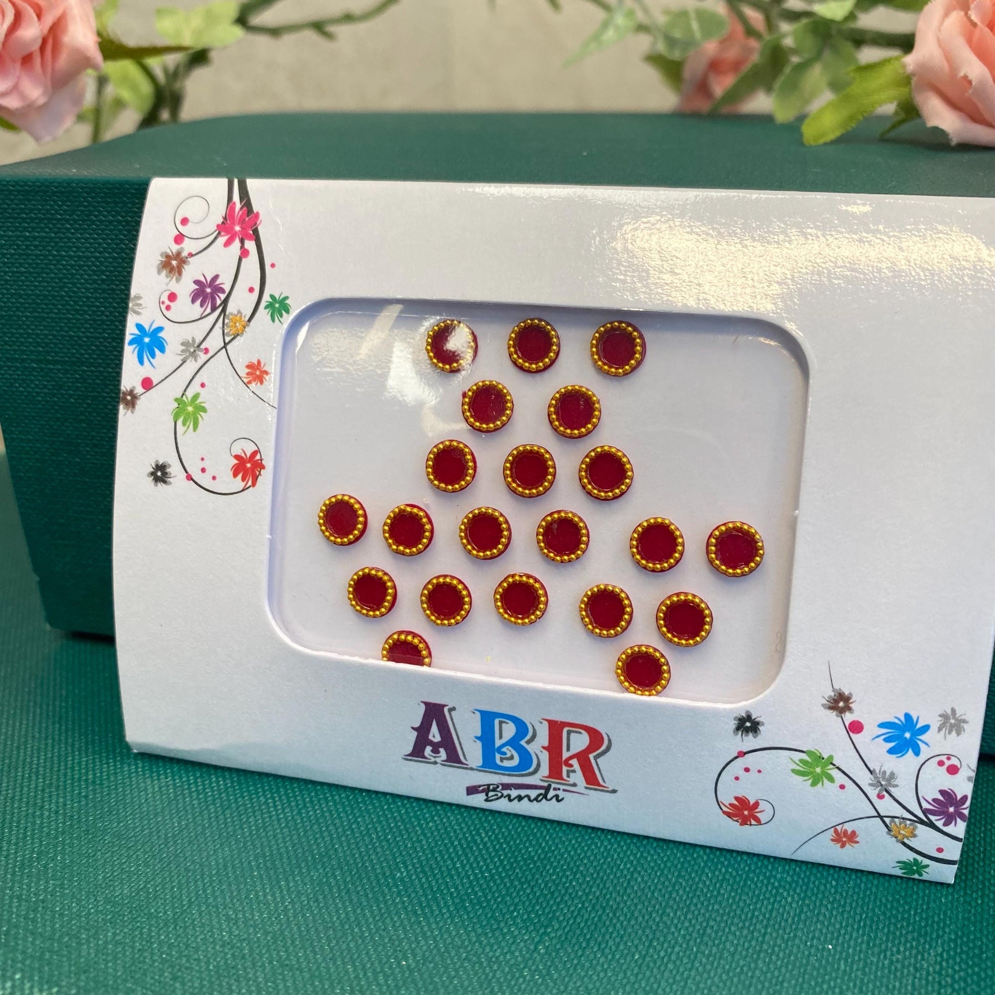 medium golden velvet pack of maroon bindis with round design.