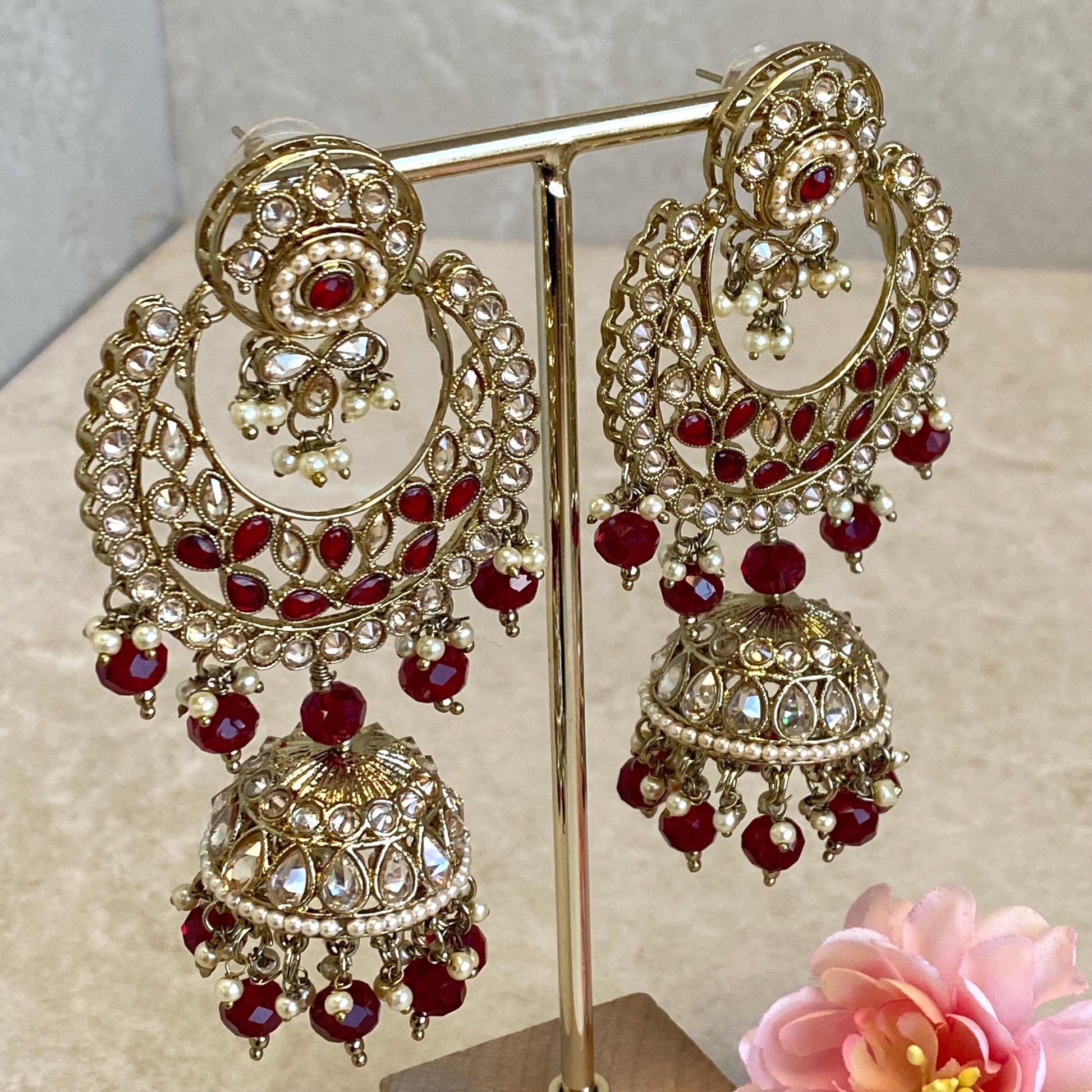 Maroon Large Antique Gold Champagne Zircon Crystal Jhumka Earring Indian Pakistani Bollywood Fashion Jewellery High Quality Gift for Her