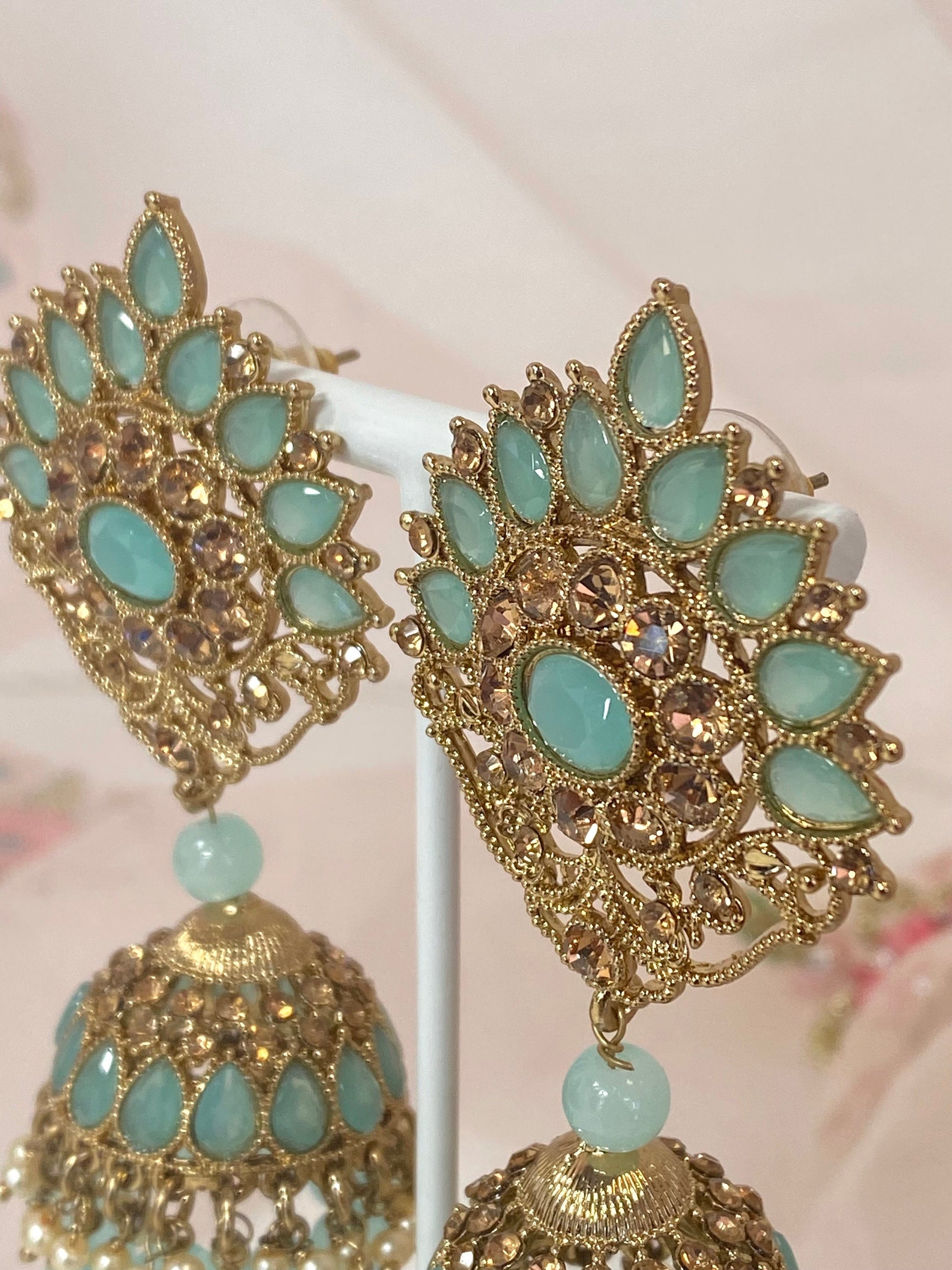 Medium golden crystal earrings with light blue beads and golden rhinestone as well as Champagne stones