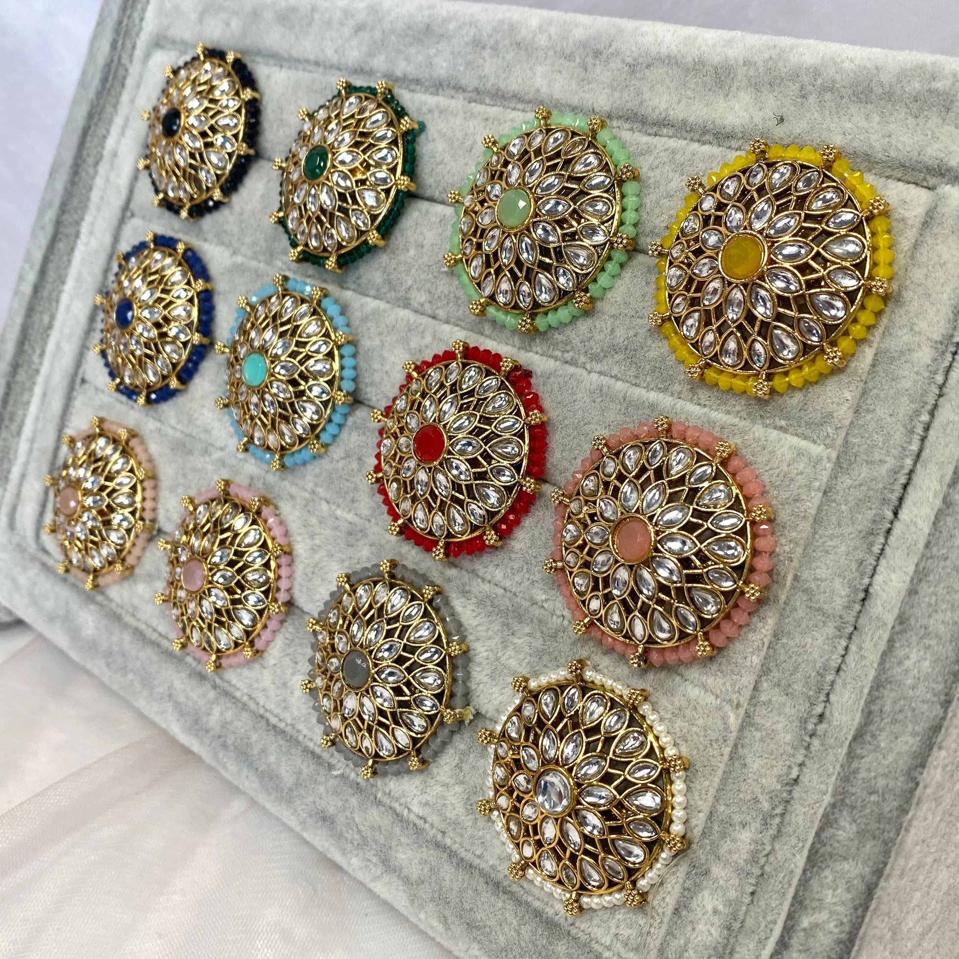 Medium Faux Kundan ring, 1.5 Inch Round antique gold and rhinestone ring with pearl beads with adjustable ring.