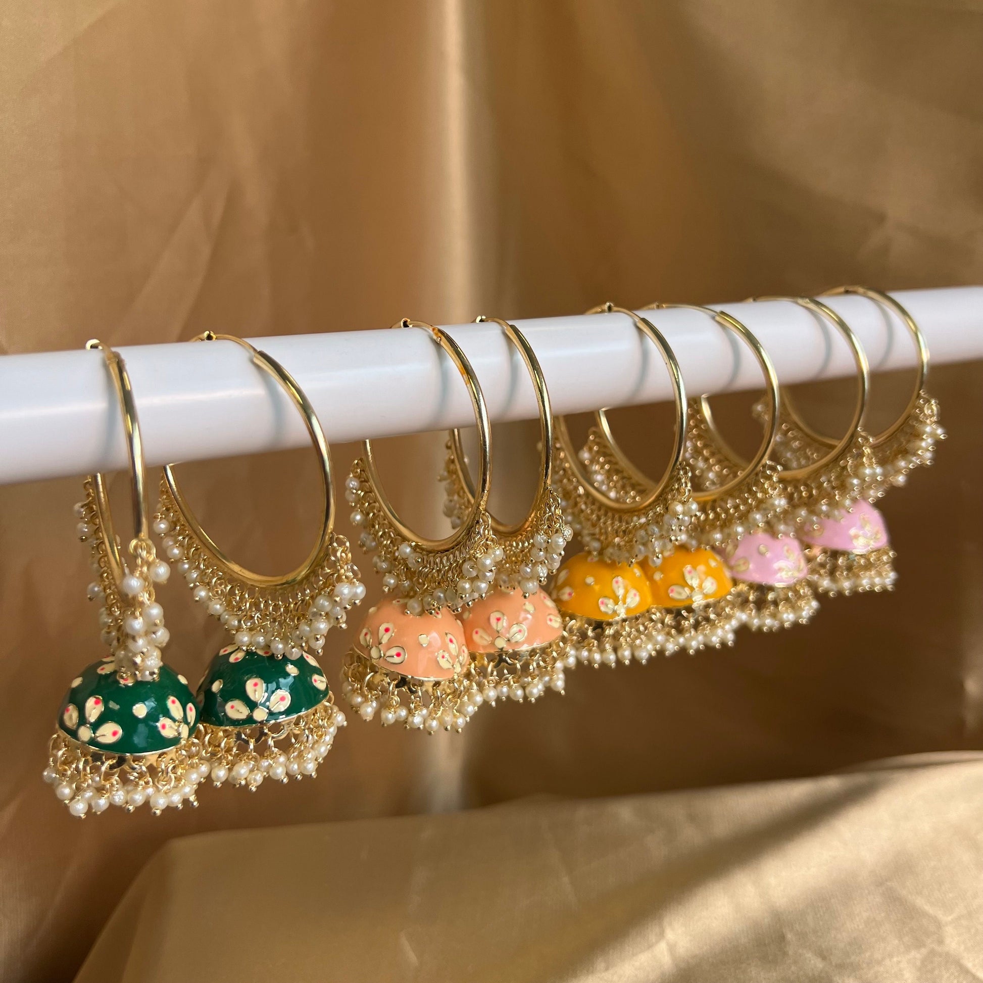 Meenakari/ Indian/ Pakistani Style/Green- Hand Painted Jhumka Hoop Earrings