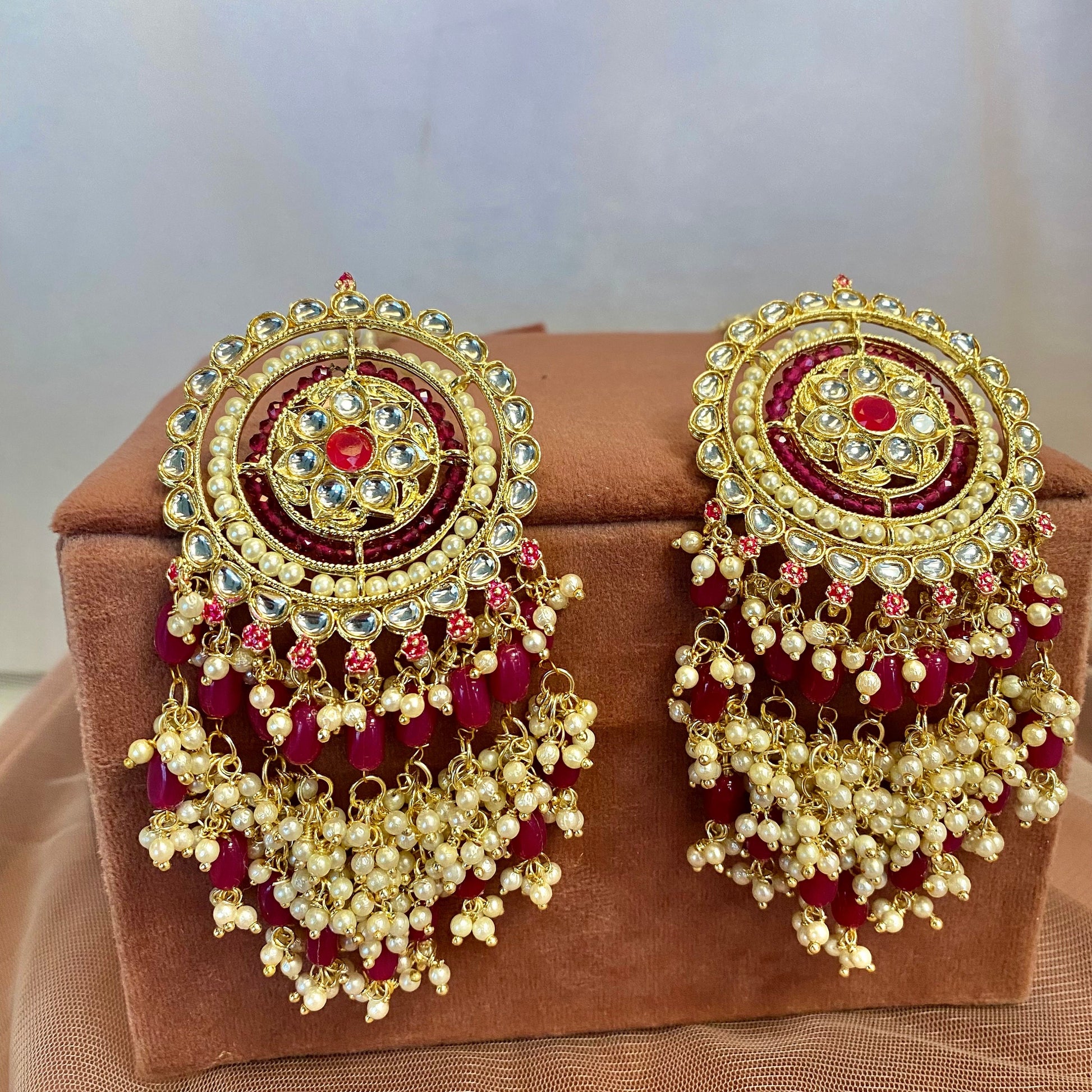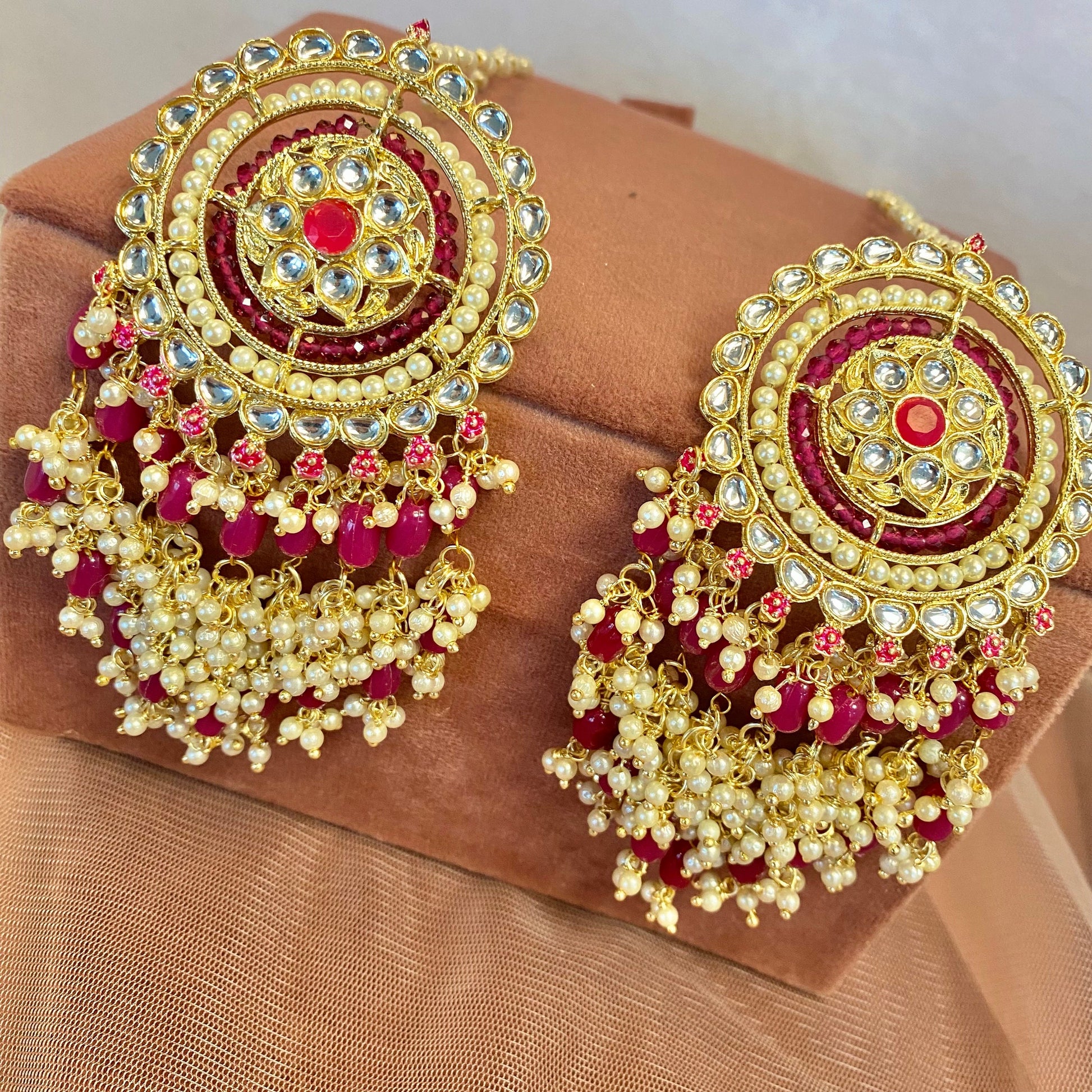 Large, Purple Hand painted earrings and tasseled detail and non detachable earring chain. with tiny pearls and faux kundan details.
