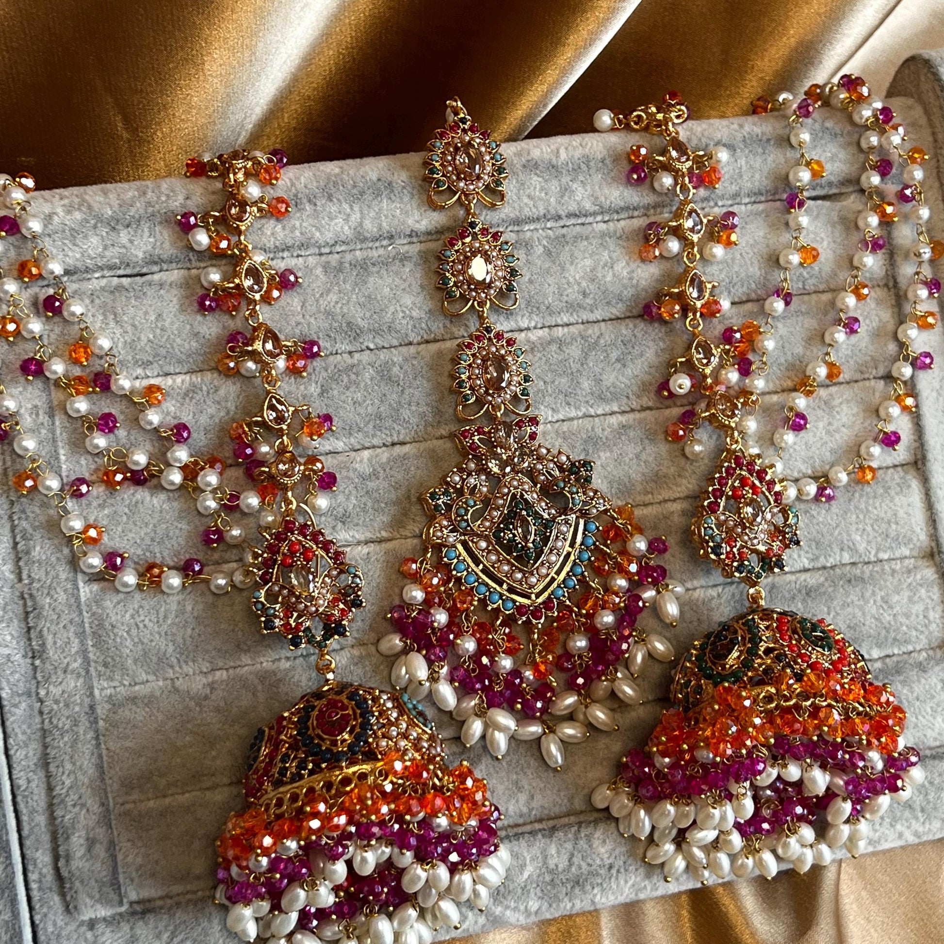 Mendhi Jewels Multicolour Necklace Large Jhumka Earrings ChainTikka Henna party Pakistani Indian Style Antique Gold Bollywood Fashion Party