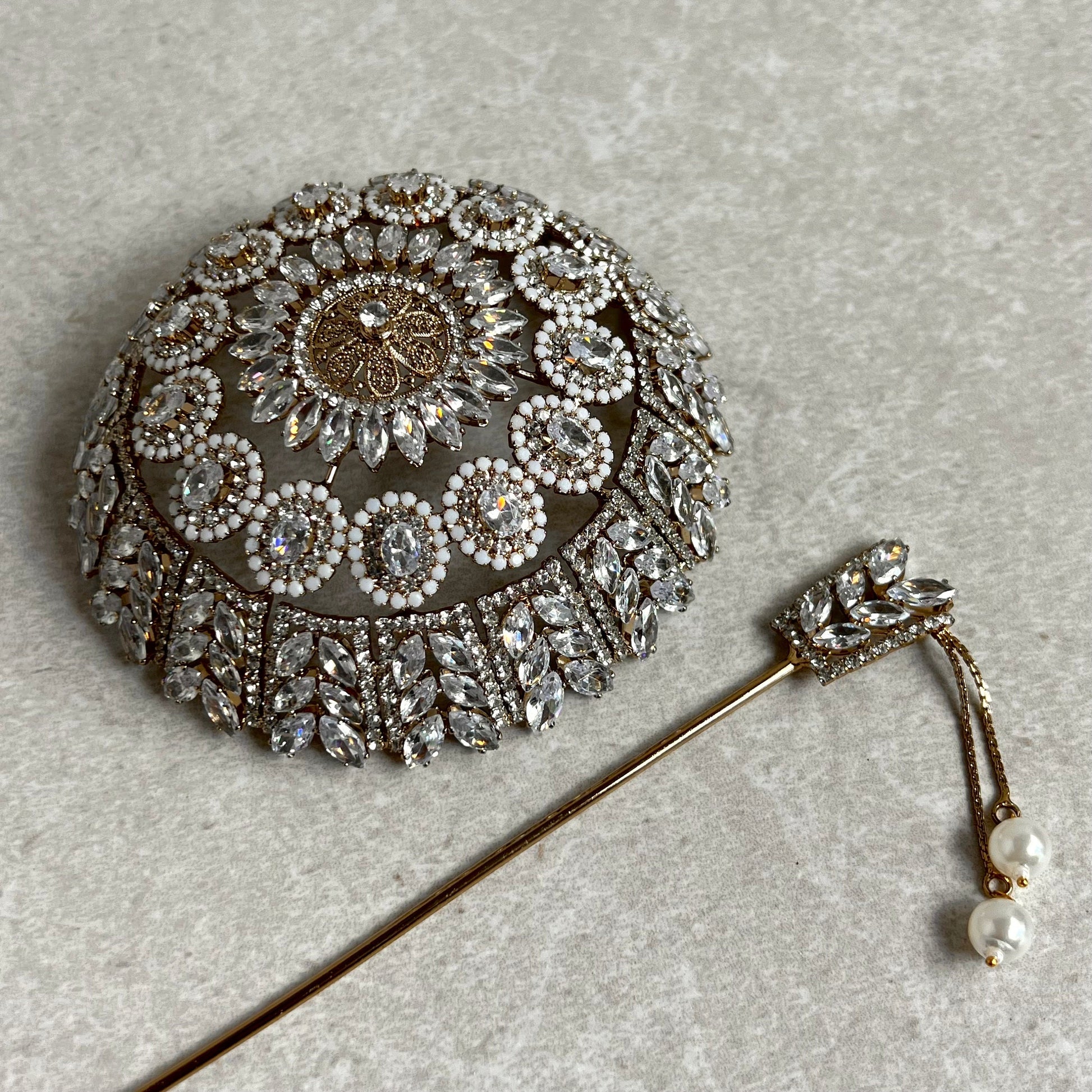 Hair accessory gold base with silver stones and stick to secure on bun for special occasions