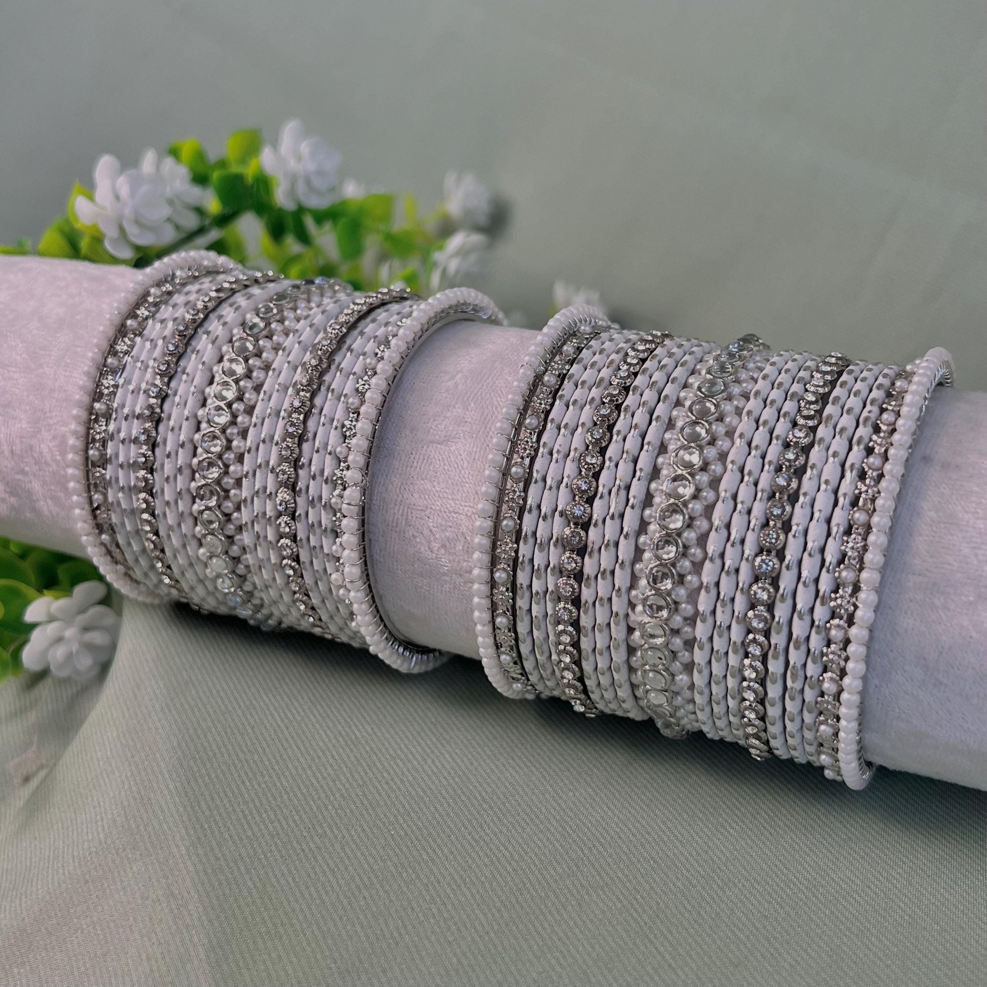 Midi White & Silver Pearly Bangle Set - Both Arms/ Silver Bangle Set/ Pearly Faux Kundan Bangles/ White Bangle Set/Indian Bangles