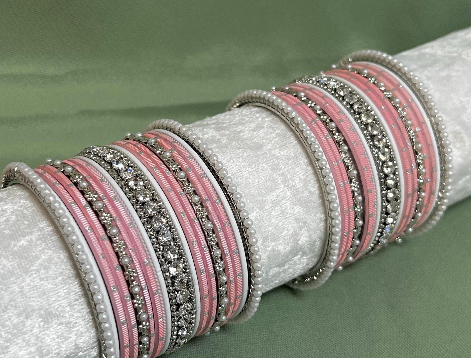 This gorgeous small bangle set includes 2 silver pearl bangles mixed with pink velvet and shinny bangles.