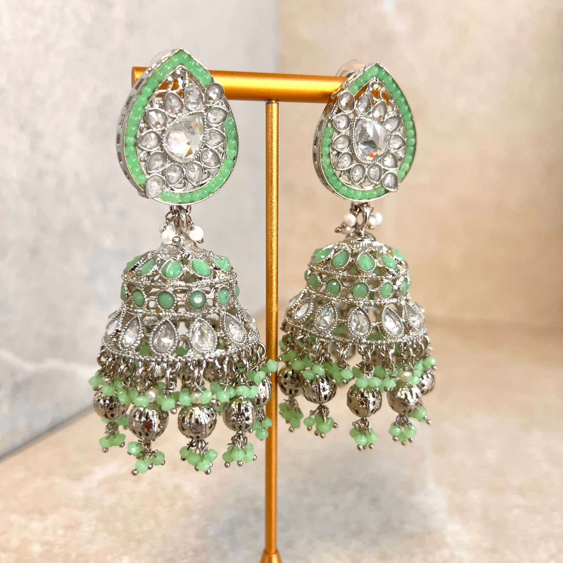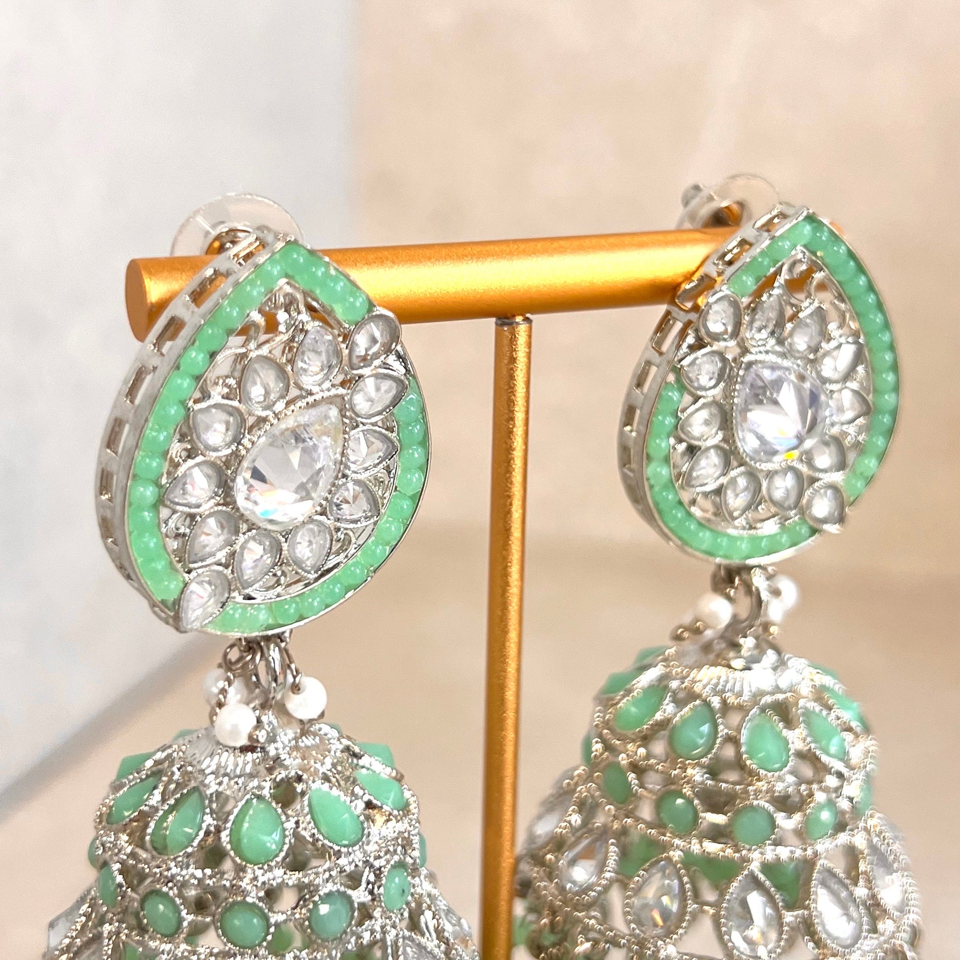 Mint and Silver Large Tear Drop Jhumka Earrings - Indian Style Earring/Pakistani fashion/ Mendhi/Party/Haldi/ Diwali Gift/ Eid Gift