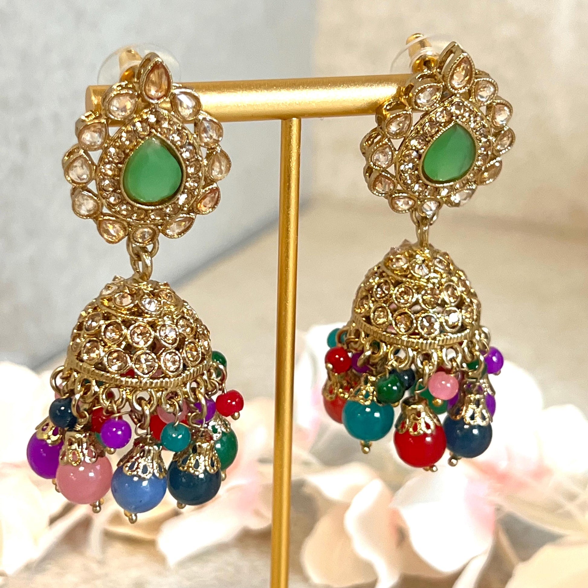 Mint Green- Multicolour Jhumka Earrings and Tikka Set/ Henna party/Pakistani/ Indian Style Earring/ Antique Gold with Champagne Crystals