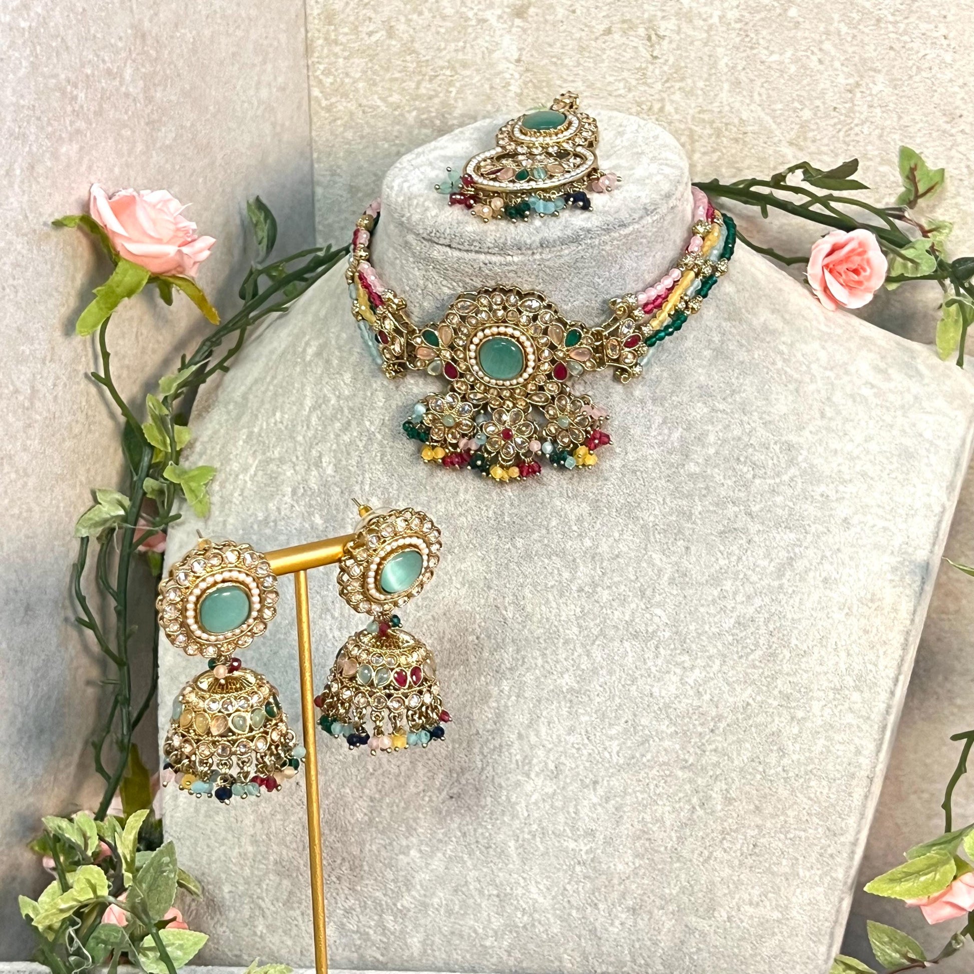 Mint -Multicoloured Choker Set with Jhumka Earring and Tikka/ Antique Gold with Champagne Zircon Crystal/Asian Jewellery/ Multiple Colours