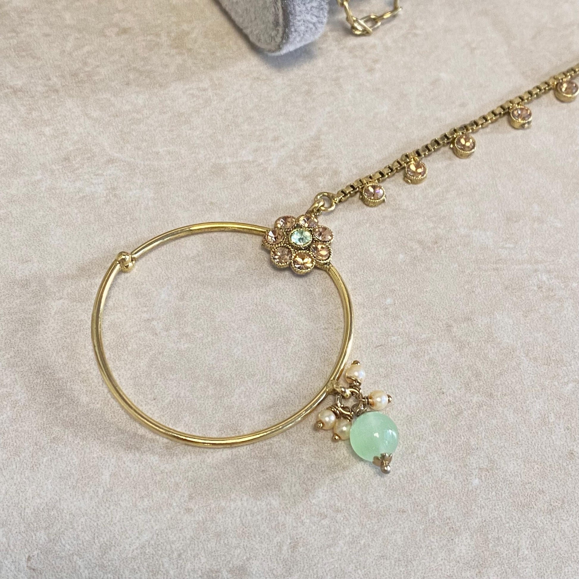 This beautiful mint and golden bridal set includes Necklace, Long haar, Jhumka Earrings with Attached Ear Chains, Tikka, Jhumar, Slide Type Nose Ring and 2 Hand Harness.
