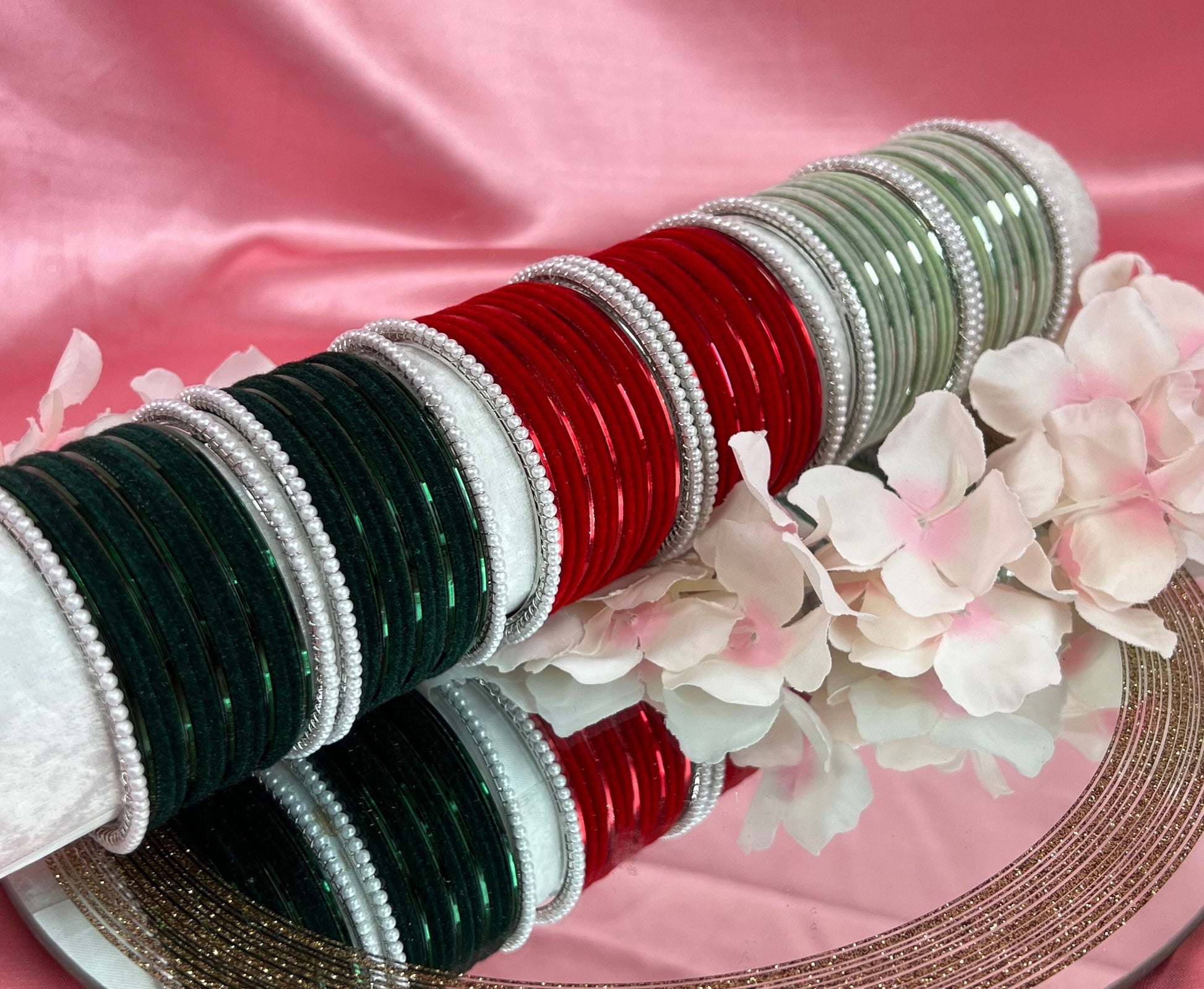 This gorgeous small bangle set includes 2 silver pearl bangles mixed with mint velvet and shinny bangles.