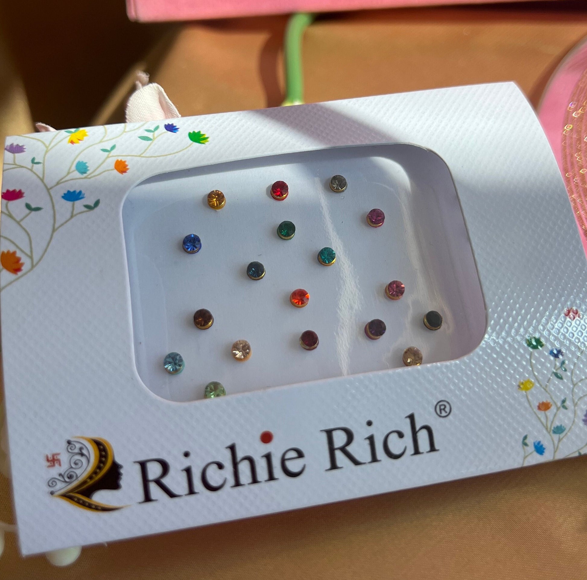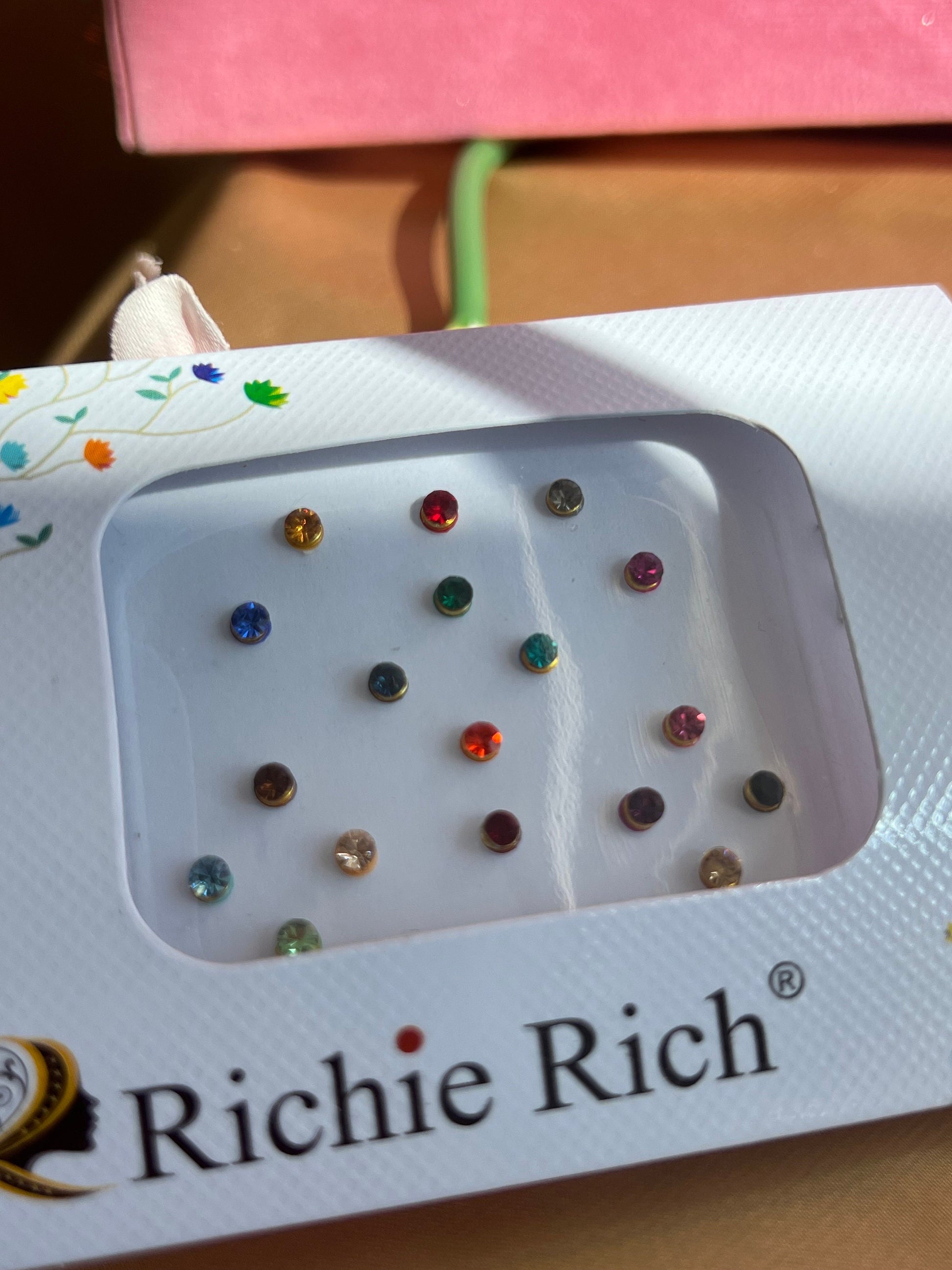 Pack of small crystal round bindis pack with multicolour colours.