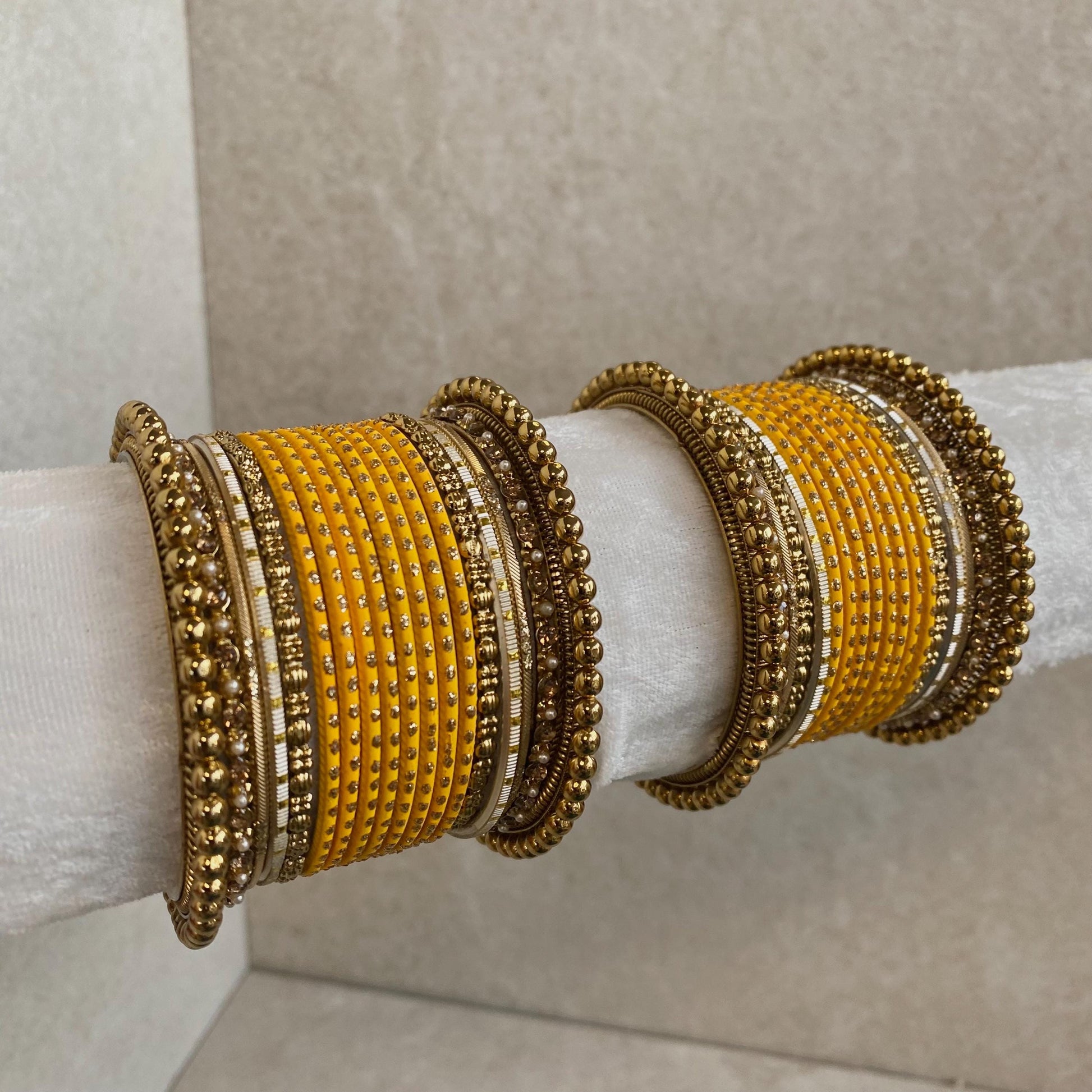 Mustard Velvet Bangle Set/Mustard Bangles/Mustard Churis/Yellow Bangle Sets/Yellow Bangles/Indian Bangles/Gold Ball Bangles