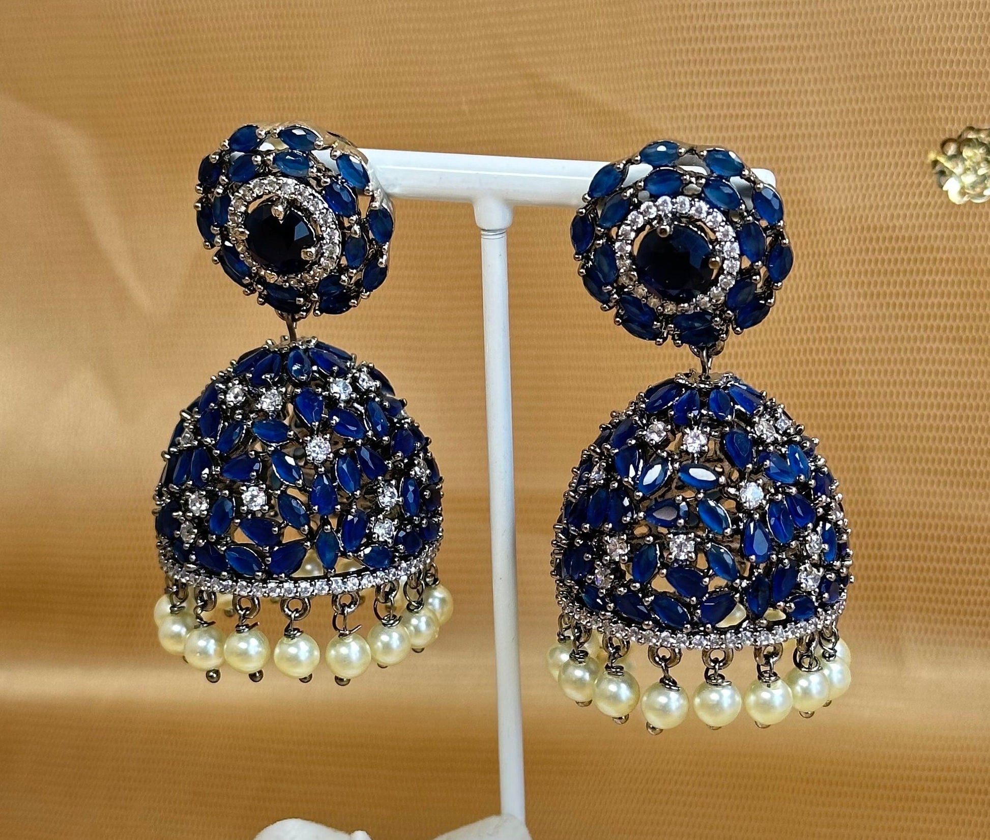 This gorgeous navy medium diamante silver jhumka earrings comes in many different colour options. Check out our other listings!
