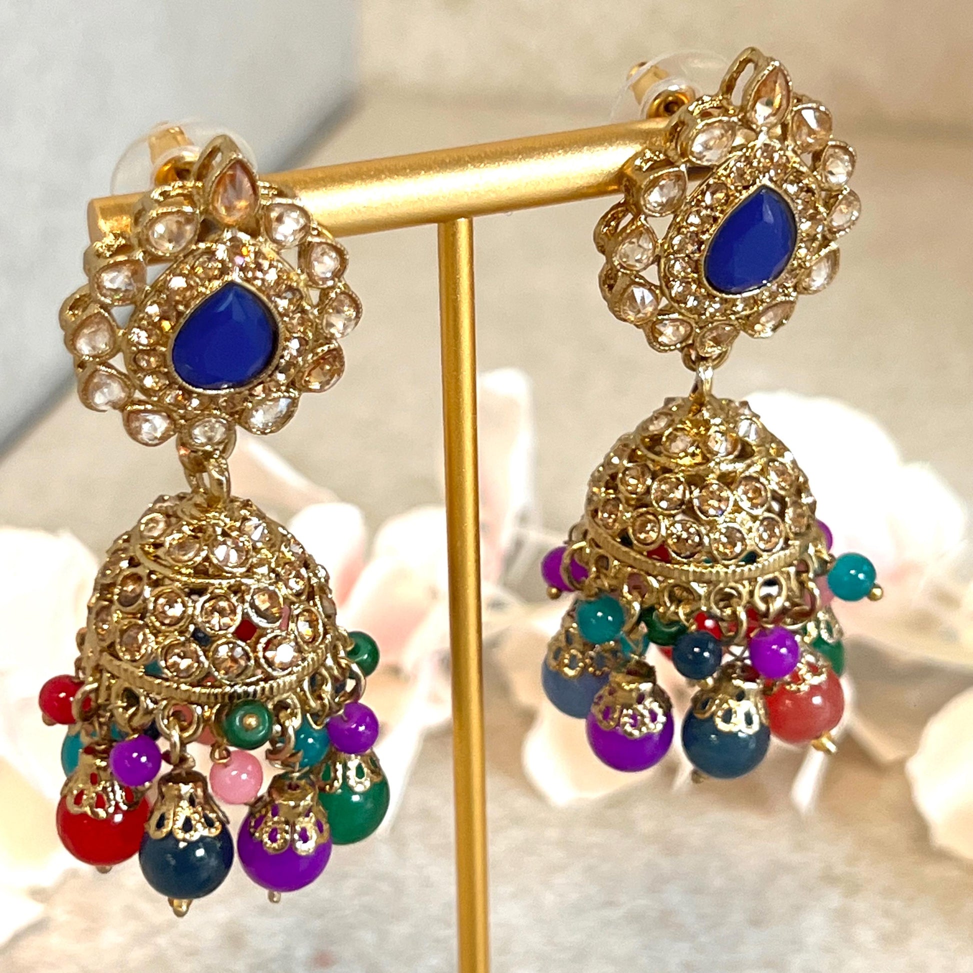 Navy - Multicolour Jhumka Earrings and Tikka Set/ Henna party/Pakistani/ Indian Style Earring/ Antique Gold with Champagne Crystals