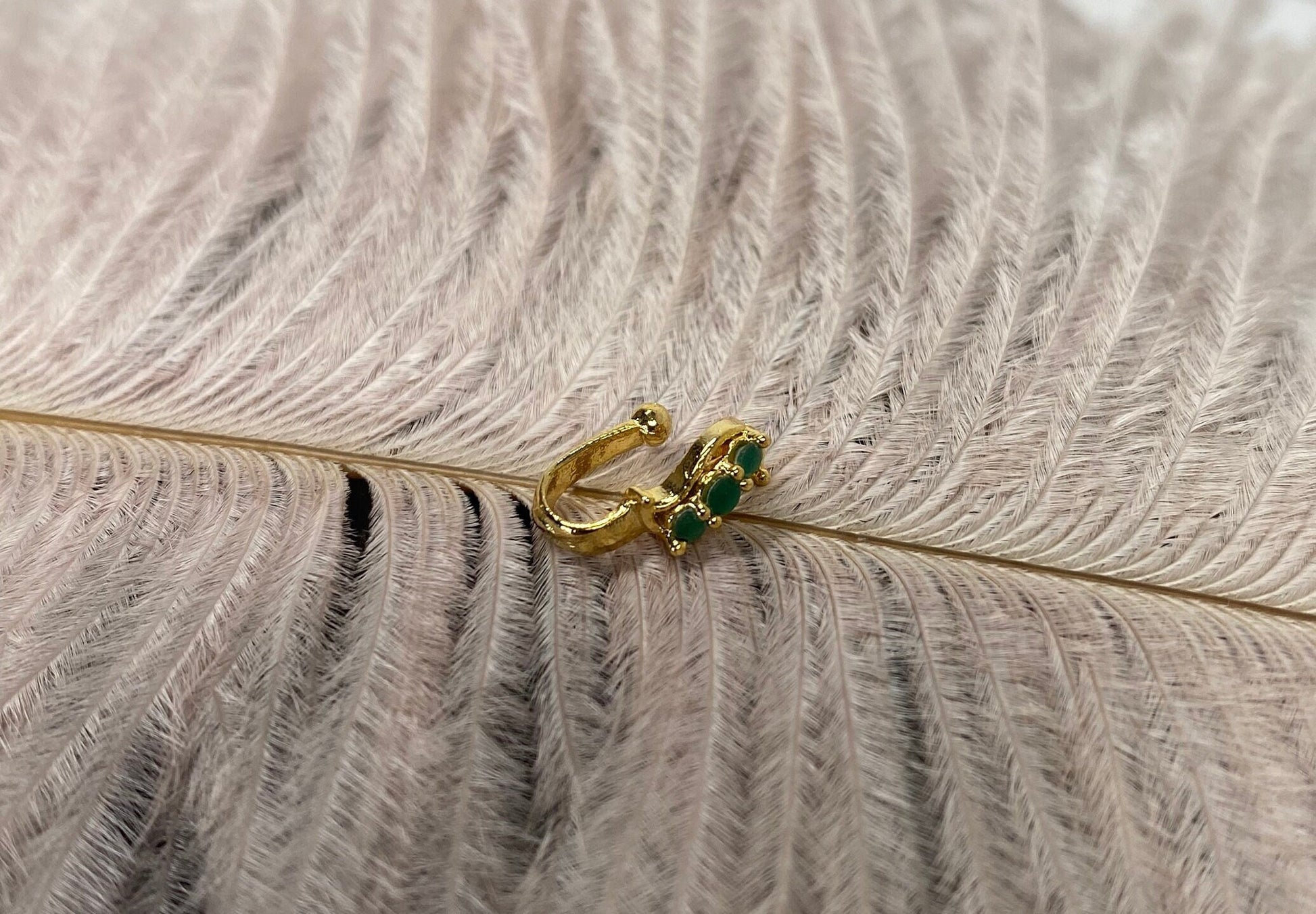 Small gold and GREEN nose ring withpin designed to be adjusted in with to hug the nostril tighly.