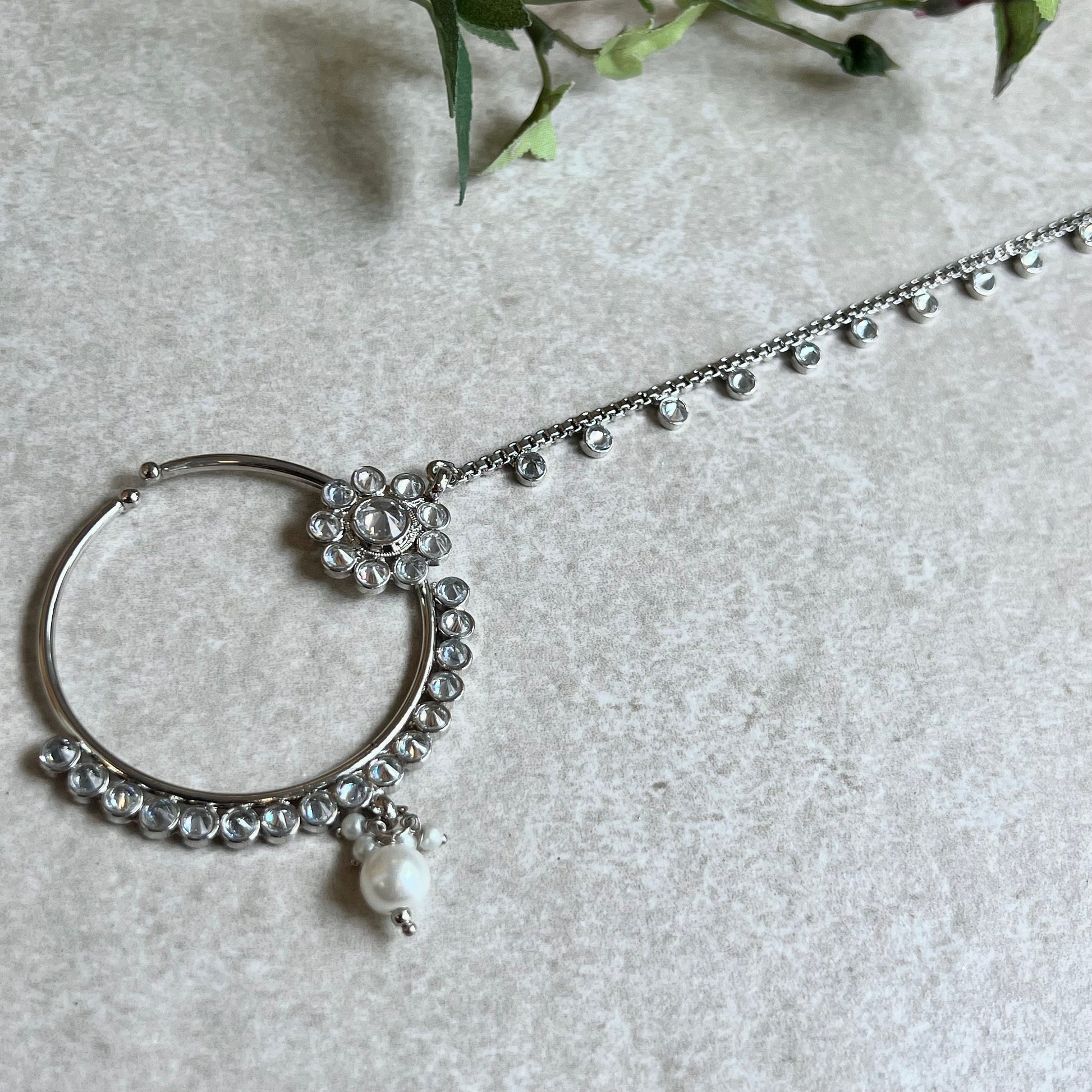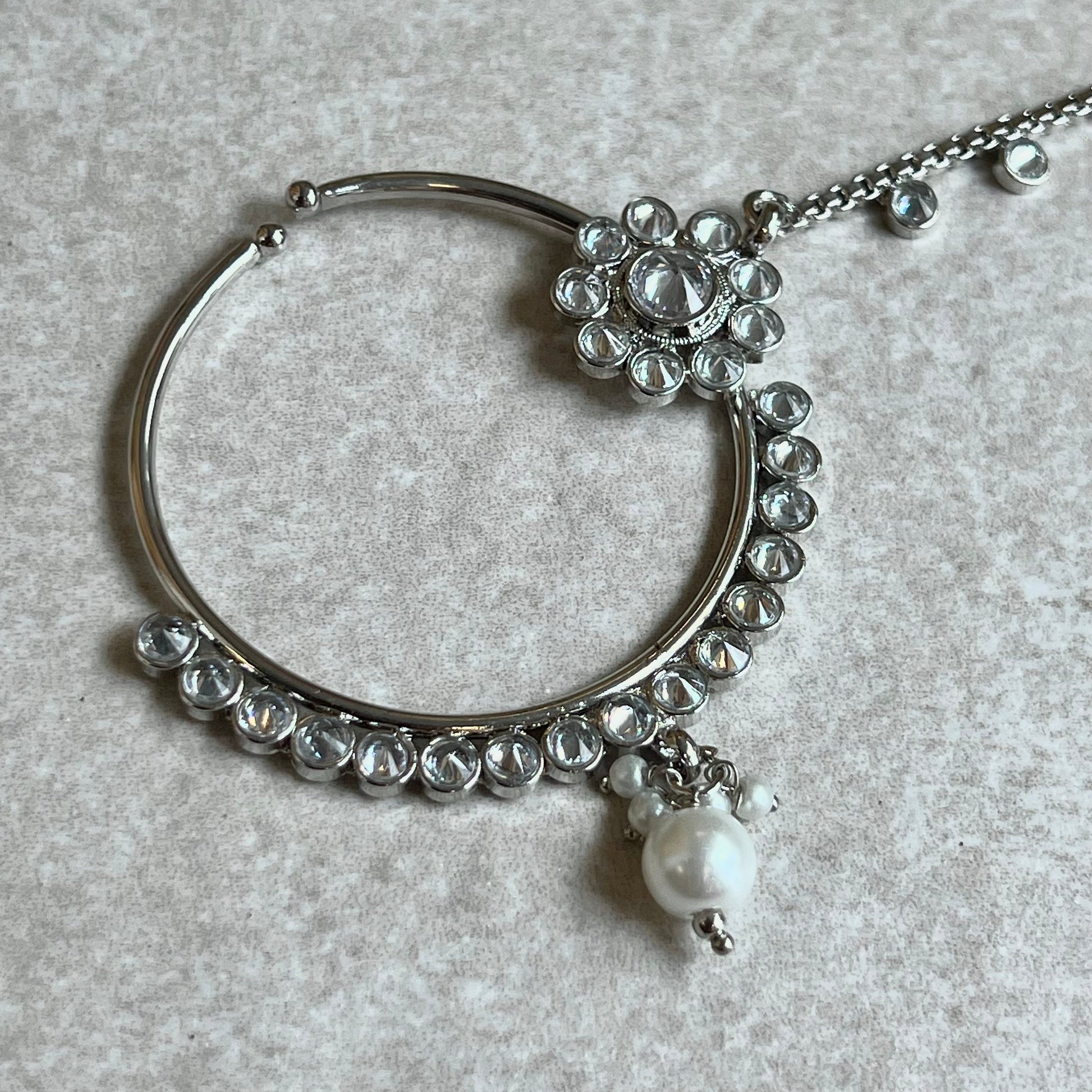 Large silver zircon crystal nose ring with silver stone and bead, designed to be adjusted in with to hug the nostril tighly by sliding on.