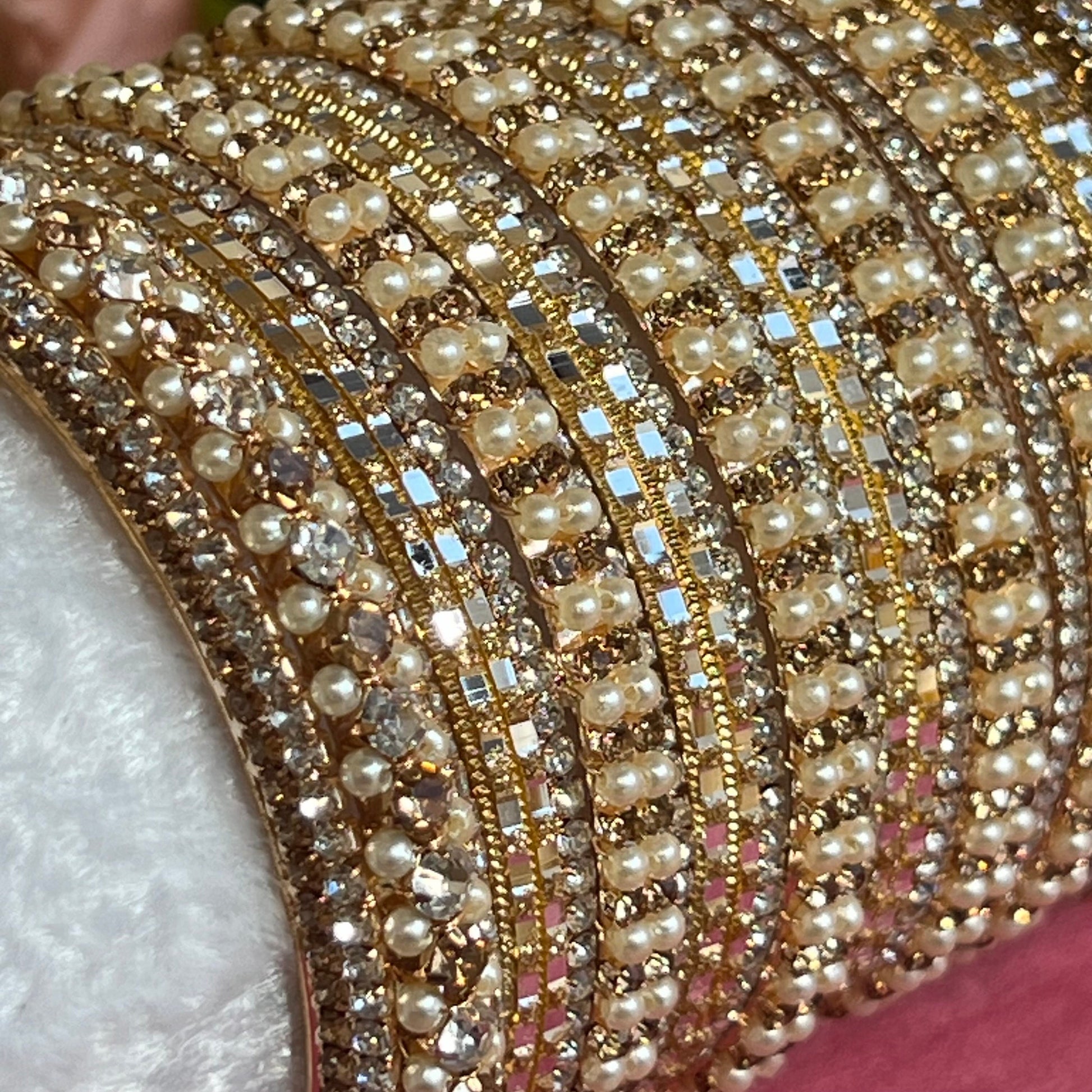 One arm only of clear pearl and crystal bangles on an antique gold base with shimmery clear/ silver stones